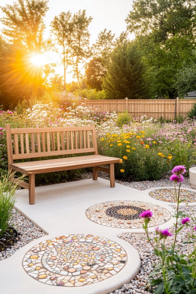 Handcrafted ceramic mosaic stepping stones lead to a wooden bench surrounded by vibrant native flowers in playful patterns. A warm golden-hour glow enhances the charm. Recreate this by incorporating artistic elements and structured bursts of color.