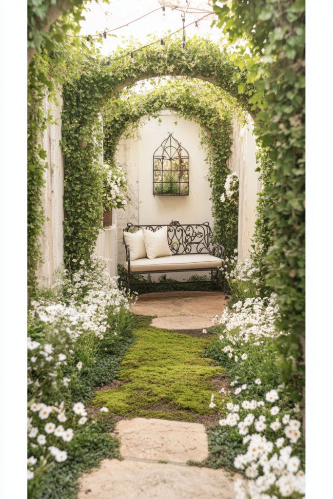 A lush escape featuring ivy-covered archways and a mossy path leading to a wrought-iron bench. This setting is delicate and romantic. Achieve the look with creeping vines, soft greenery, and a gently worn pathway.