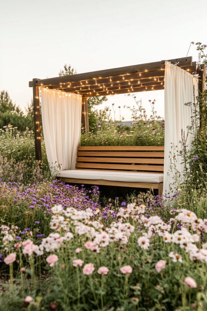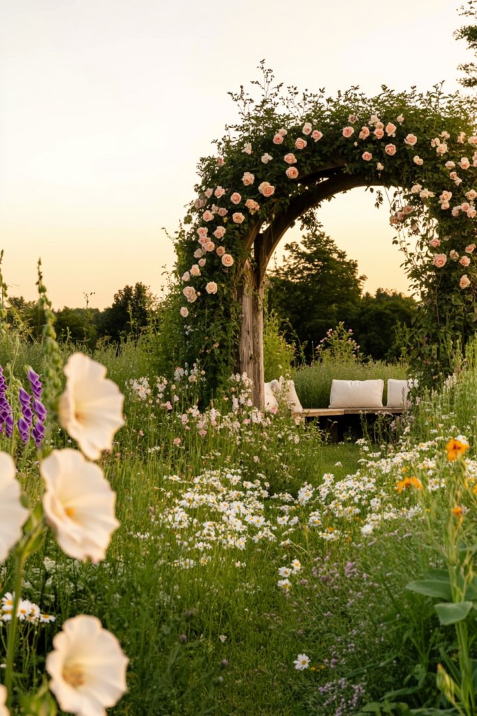 A charming wildflower field with a rustic wooden archway covered in climbing . A quiet nook among foxgloves and daisies adds to its romantic appeal. Achieve this look with flowering archways, dense floral borders, and soft twilight lighting.
