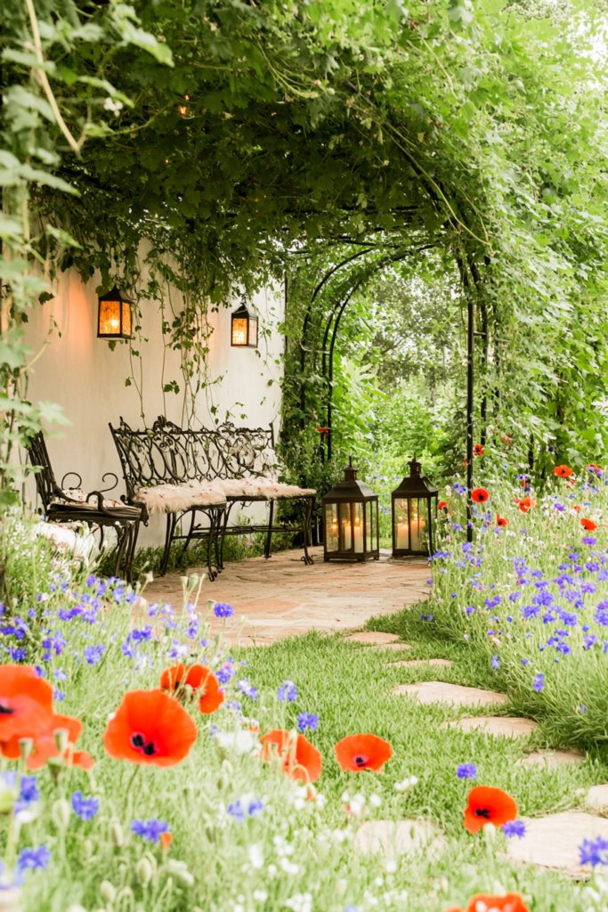 An enchanting space where vintage wrought-iron seating hides beneath a vine canopy, surrounded by poppies, cornflowers, and yarrow. Softly glowing lanterns add magic. Recreate this look with climbing plants, bold wildflowers, and ambient lighting.