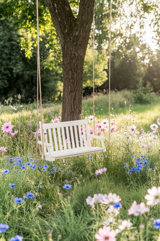 A dreamy scene featuring a delicate white swing enveloped by pink cosmos, blue cornflowers, and chamomile. Sunlight filters through the trees, adding warmth. Achieve this look with a vintage swing, pastel blooms, and soft, flowing greenery.