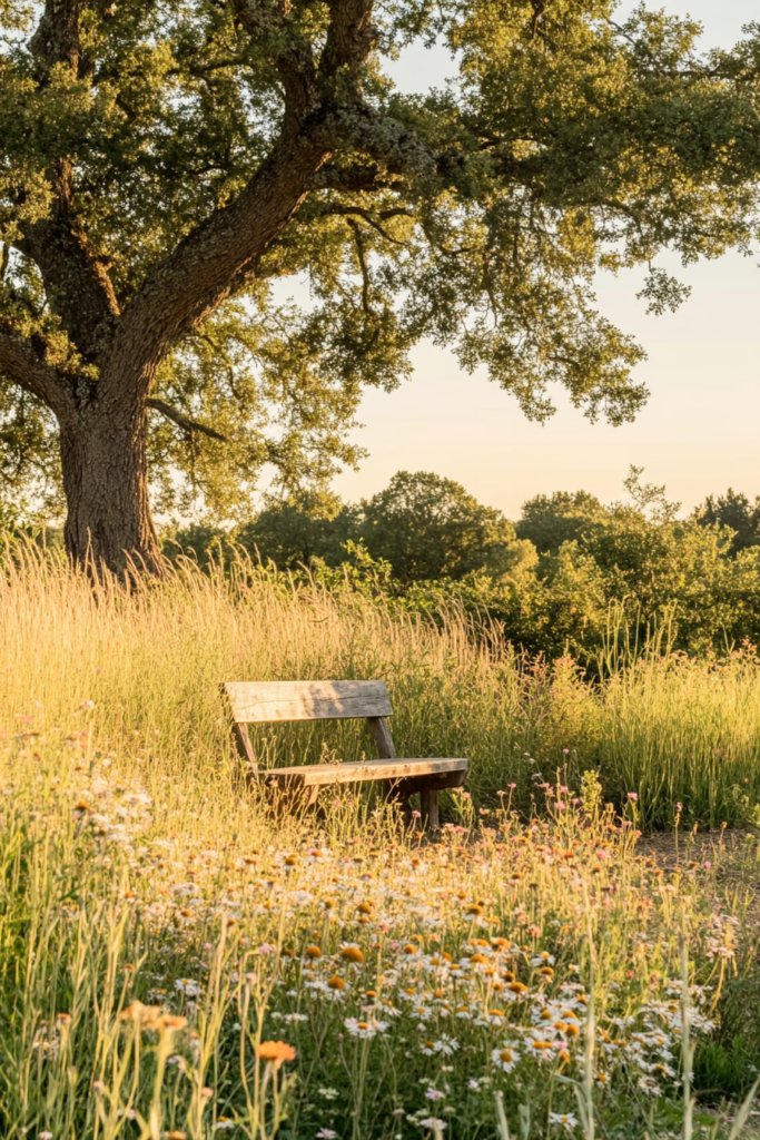 A hidden sanctuary with a wooden bench resting under an ancient oak, surrounded by tall native grasses. The golden glow of sunset enhances its peaceful beauty. Capture this ambiance with warm-hued wildflowers and cozy, shaded seating.