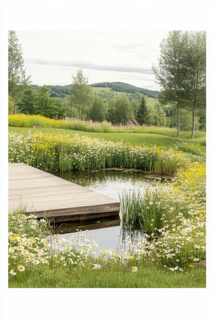 A serene escape with a rustic wooden dock overlooking a small pond, surrounded by soft yellow and white wildflowers. To create this atmosphere, use native wetland plants and a weathered wood deck for a tranquil waterside retreat.