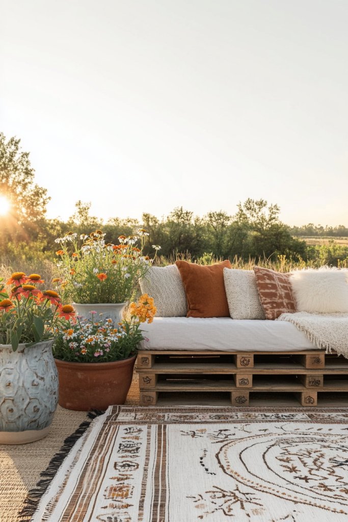 Repurposed wooden pallets become cozy seating, complemented by eclectic ceramic planters and soft rugs under golden afternoon sunlight. Capture this aesthetic with DIY furniture, vintage textiles, and a variety of native blooms.
