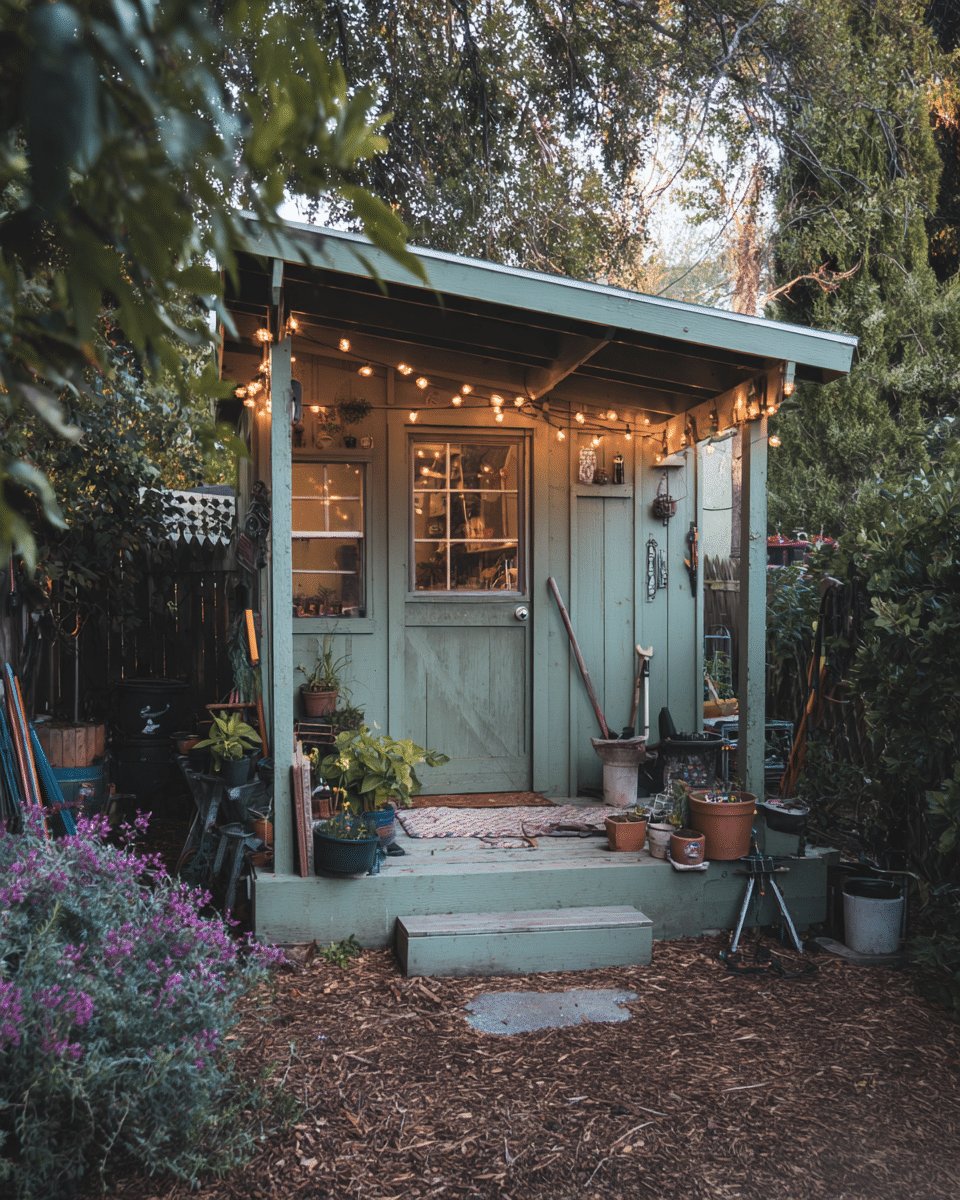 I love how the soft sage paint and tiny porch make this shed feel like a secret little clubhouse. The string lights give instant cozy mood, and the mix of potted plants, mismatched tools, and a battered rug reads like a lived-in, useful space rather than a staged prop.