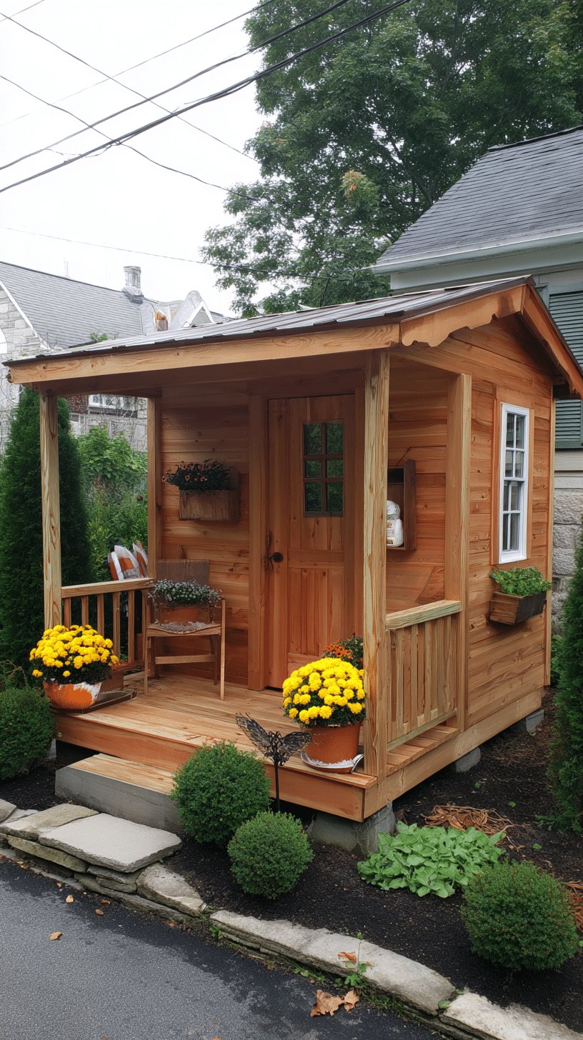 I love the warm cedar glow and the tiny-porch energy of this shed — it feels like a peaceful little retreat you actually want to sit on. The scalloped eave detail, window box, and those cheerful yellow mums give it instant personality without trying too hard.