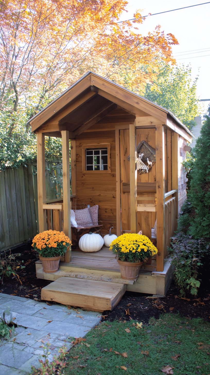 I love the warm cedar glow on this little shed and the way the porch reads like a tiny, private hangout. The mums and white pumpkins give it instant cozy fall vibes without feeling overdone, and that wicker chair with soft pillows says come sit for five minutes.