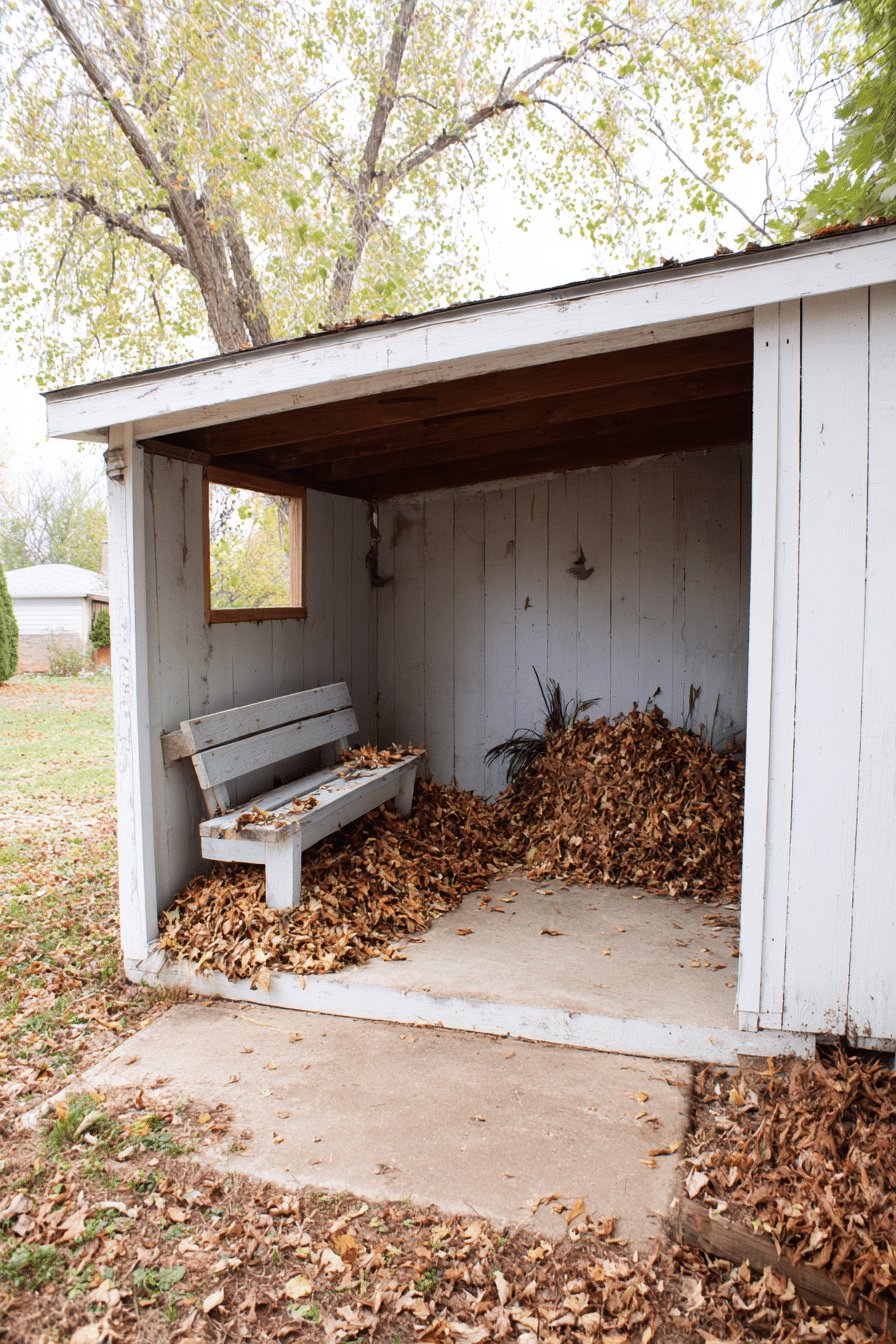 I love the easy, slightly weathered charm of this garden shed with porch. The pale, worn paint, exposed rafters and the bench half-buried in autumn leaves give it instant storybook energy and a feel like someone paused mid-project and went to make tea.