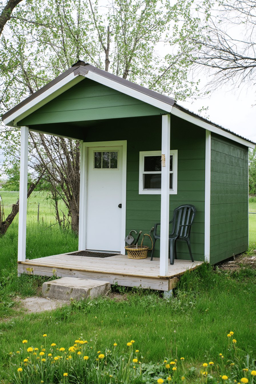 I love the cozy, no-fuss vibe of this little green shed with its tiny porch. The deep green siding and crisp white trim feel calm and friendly, like a secret garden clubhouse.