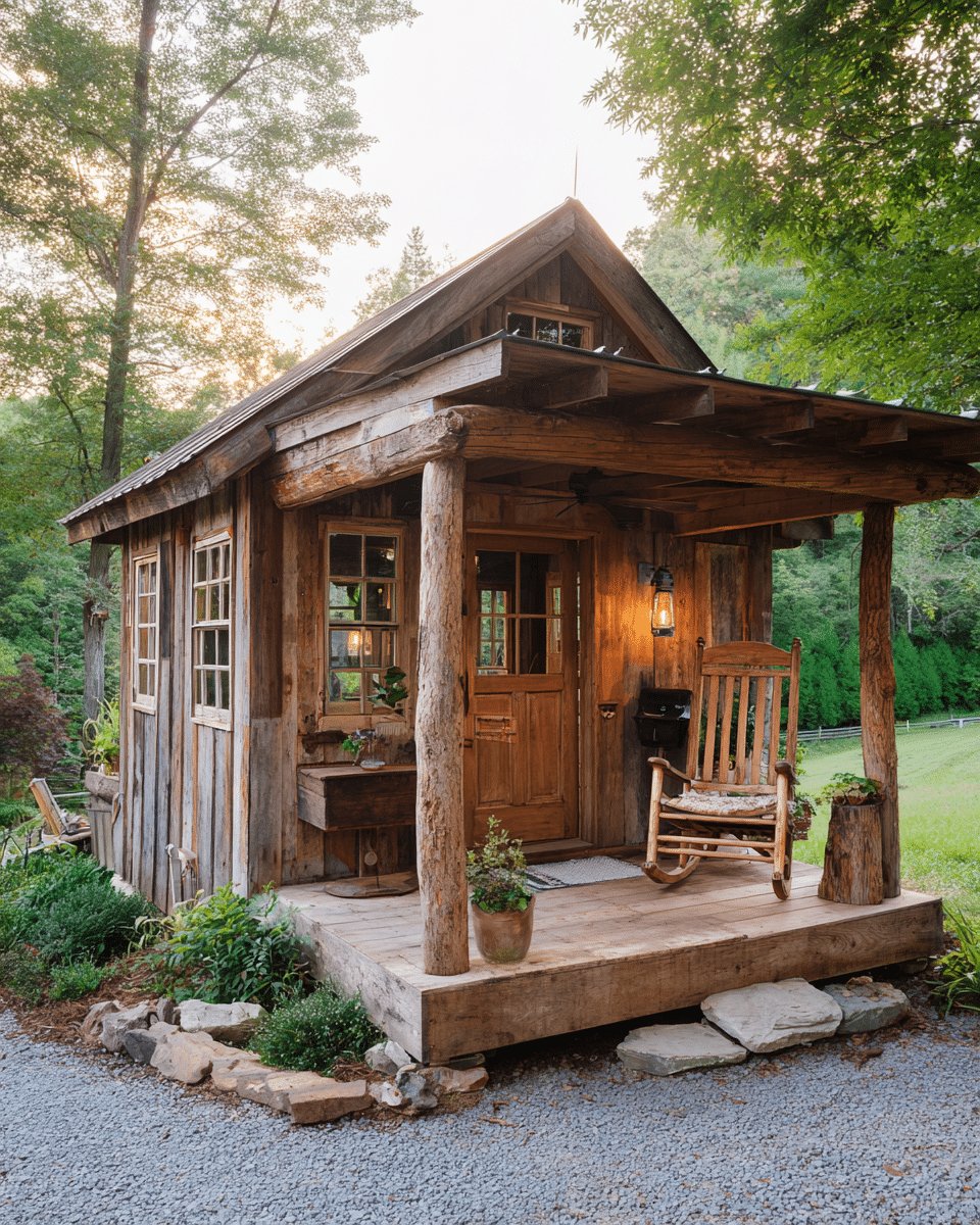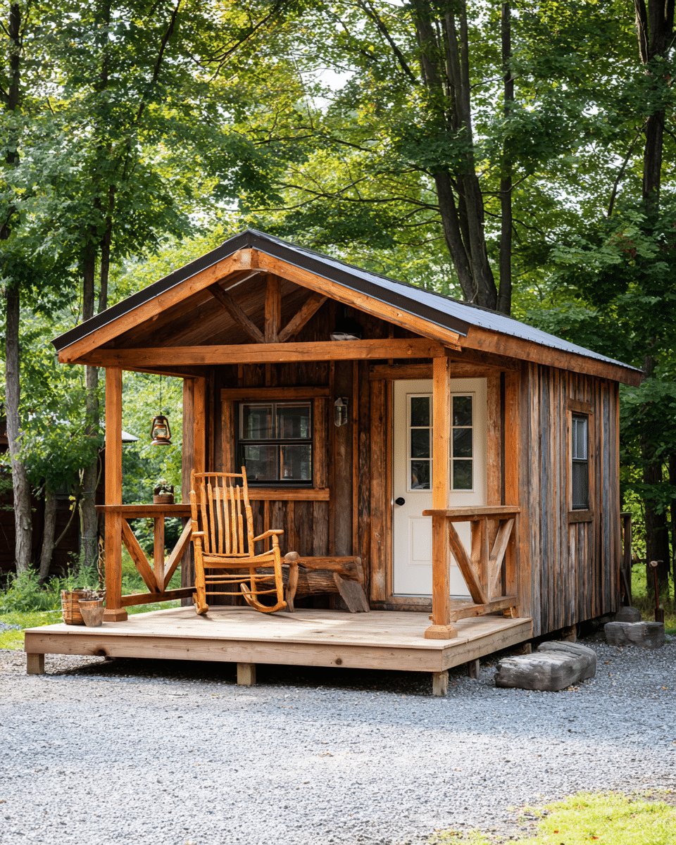 I love the sun-warmed, slightly weathered wood and that tiny porch that basically begs for slow mornings with coffee and a book. The exposed beams and the rocking chair give this shed instant cozy vibes without trying too hard.