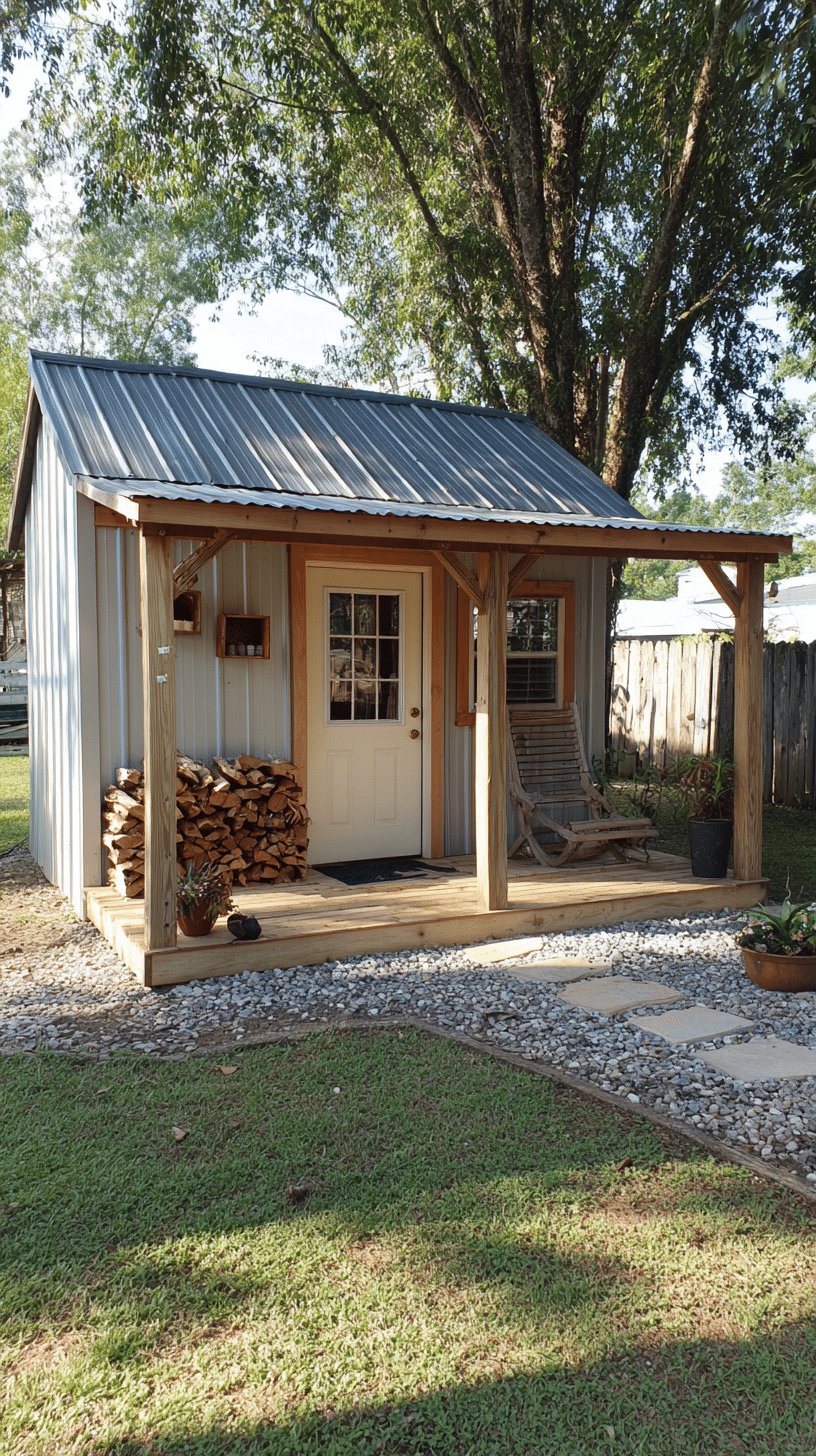 I love the cozy, no-fuss vibe of this little shed with its porch. The mix of corrugated metal and warm, raw wood gives it both cottage charm and hands-on practicality, and that stack of firewood plus the slouchy wooden chair reads like an invite to slow down.