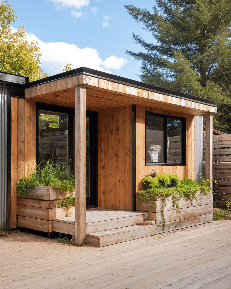I love how the warm cedar cladding and the small covered porch make this shed feel like a cozy little hideaway. The built-in planter boxes spilling greenery over the edges soften the clean lines and make the whole thing feel lived in and inviting.
