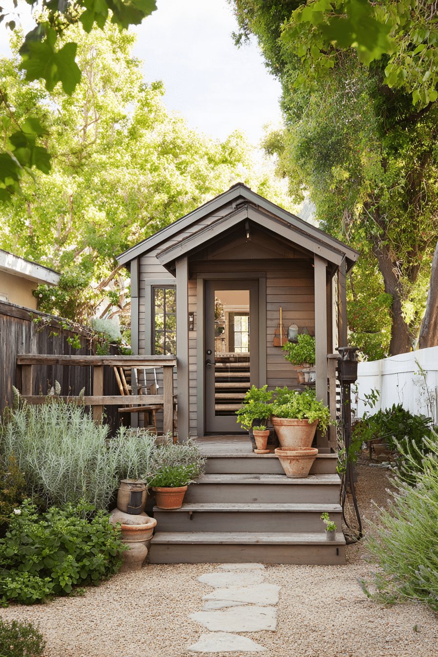 I love the tiny, secret-garden feel of this shed with its petite porch. The soft gray siding and weathered wood railing read timeless but relaxed, and those terracotta pots stacked on the steps add instant warmth and personality.