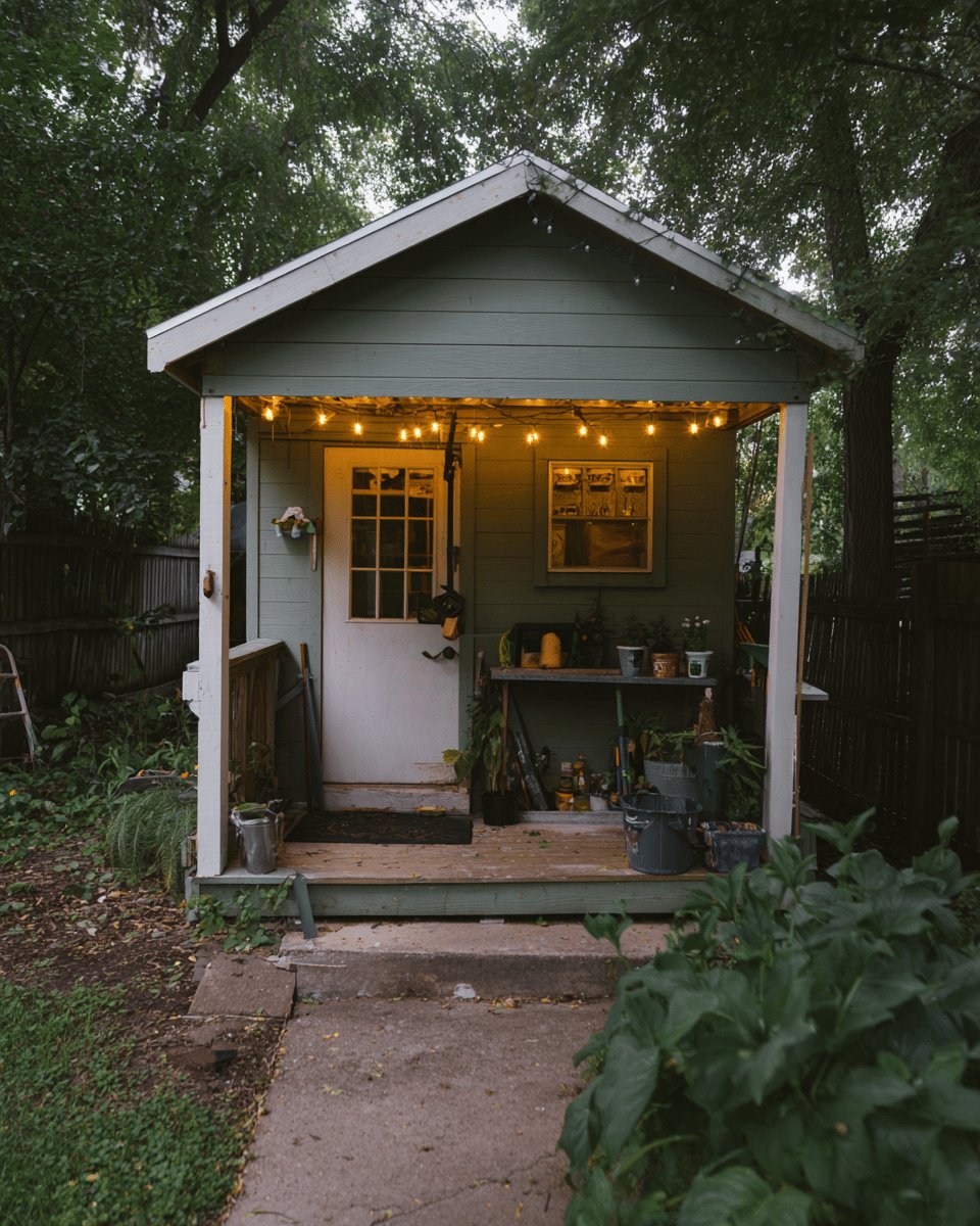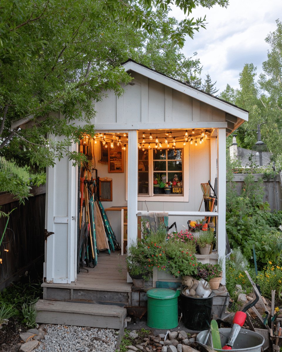 I love the cozy, lived-in vibe of this little shed and porch. The string lights give that soft lighting, soft life energy that makes evening potting feel like a tiny celebration, and the jumble of tools and pots reads as charming, not messy.