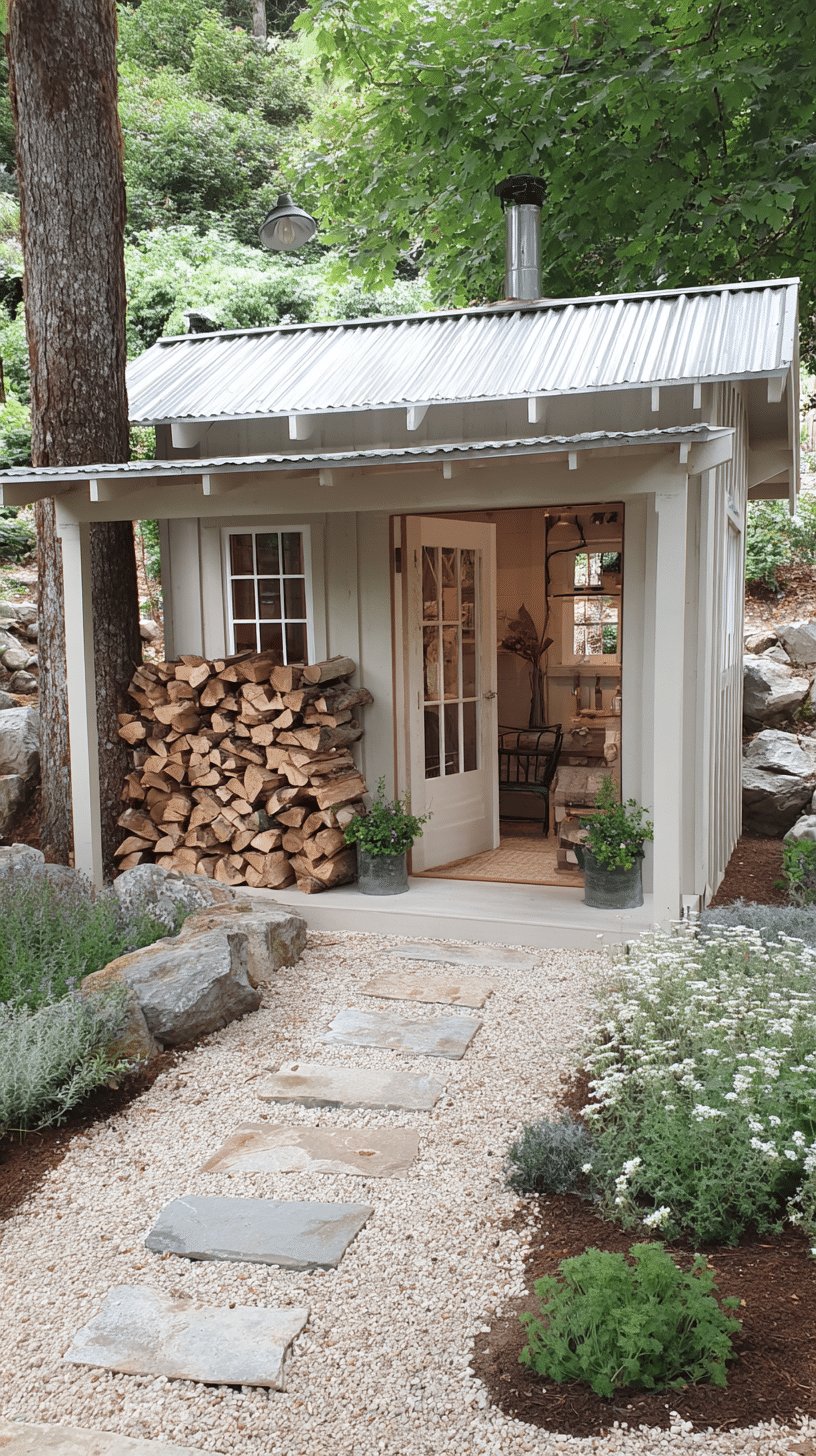 I love how simple materials and a sweet porch make this shed feel like a tiny escape. The pale board and batten, corrugated roof, and that neat stack of firewood read cozy without trying too hard.