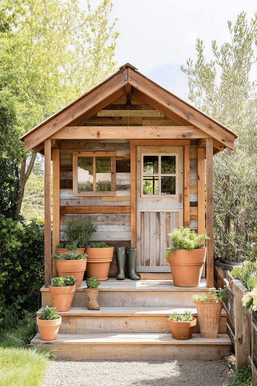 I love the warm, lived-in charm of this little garden shed with porch. The mix of reclaimed wood planks and the simple gable roof feels cozy without trying too hard, and those terracotta pots lined on the steps give it instant personality.