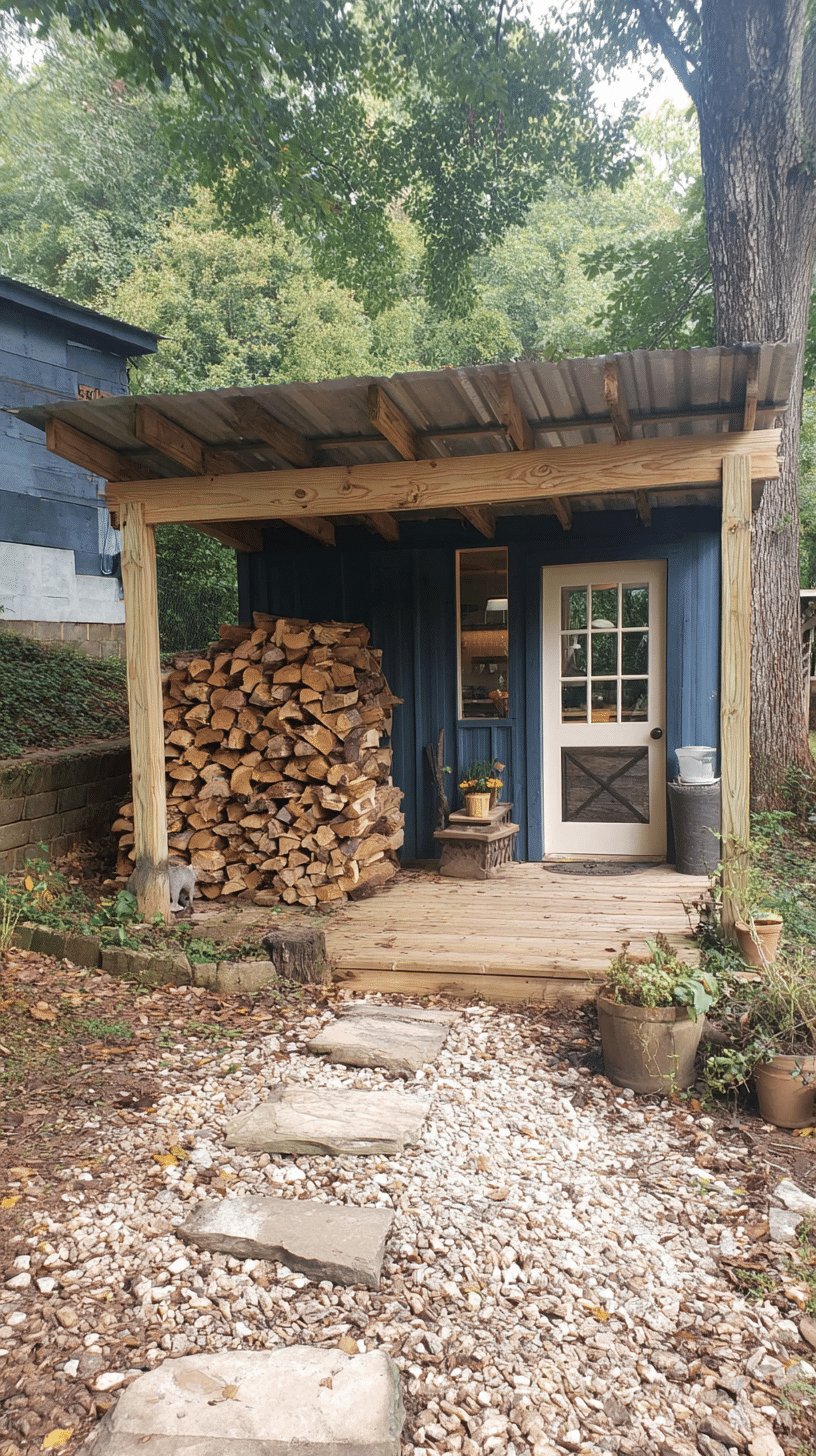I adore the cozy, lived-in vibe of this garden shed with porch. The deep blue siding and white crossbuck door feel like a little secret cabin, and that neat stack of firewood doubles as decoration and practicality.