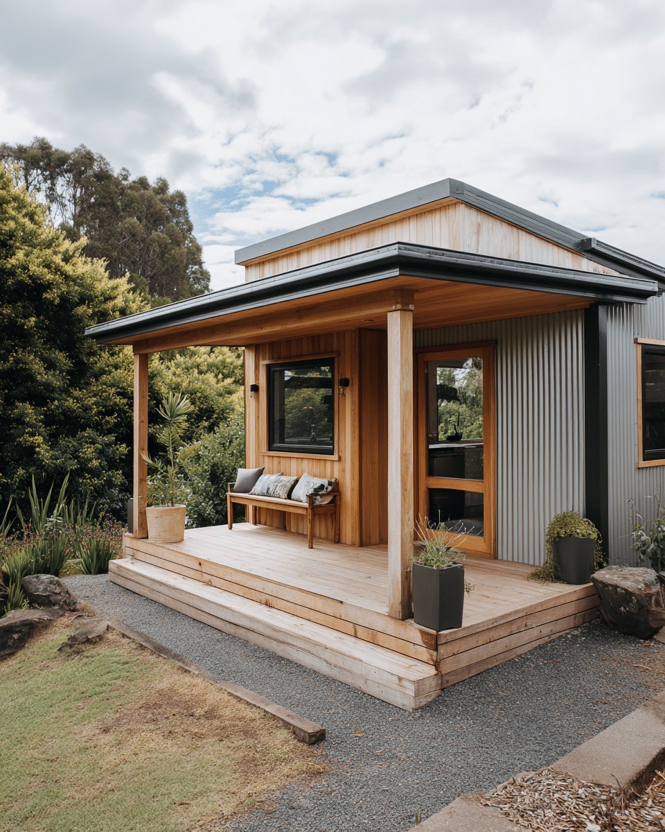 I love the warm, easy vibe of this garden shed with porch. The pale cedar cladding paired with corrugated metal gives it that perfect mix of cozy and cool, and the covered porch reads like an instant hangout spot for coffee or a quiet read.