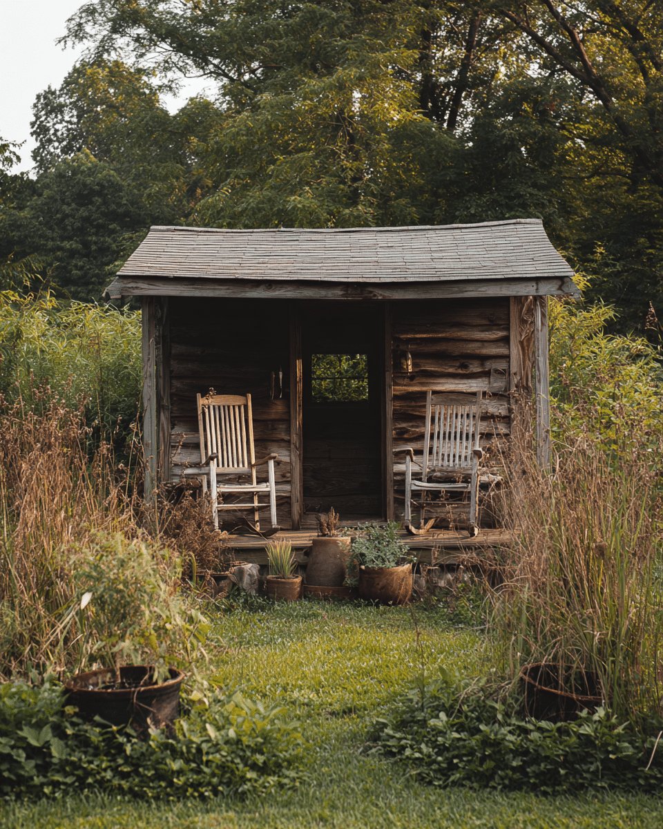 I love the slow, weathered charm of this little shed with its tiny porch and two rocking chairs. The sun-bleached wood and leaning roof feel honest and unbothered, like a spot made for long mornings and late afternoon tea.
