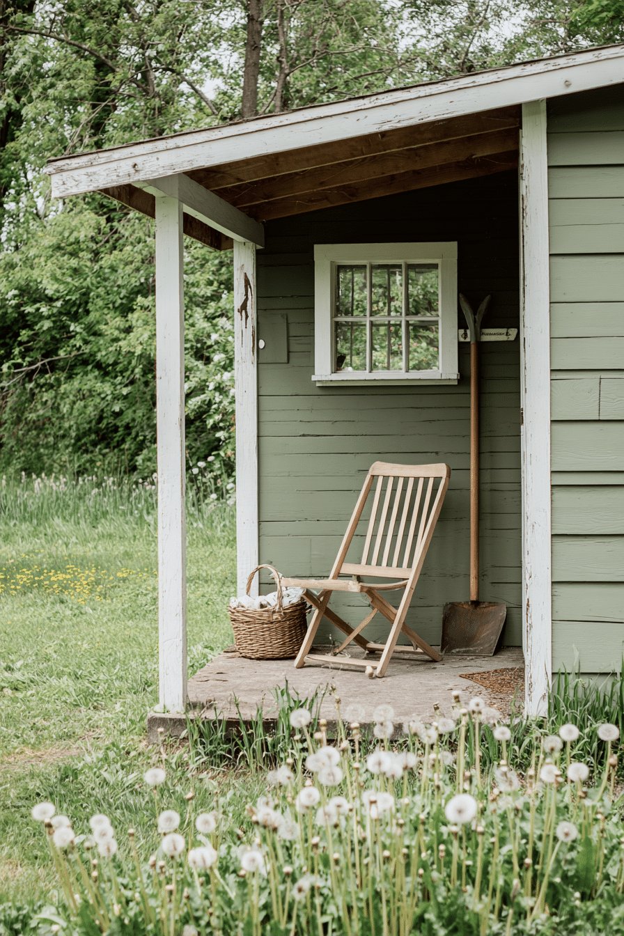 I love the calm, lived-in vibe of this little green shed. The soft sage paint and chipped white trim feel like a hug for the garden, and that simple folding chair plus woven basket reads like the kind of spot I would actually park myself with a mug and a book.