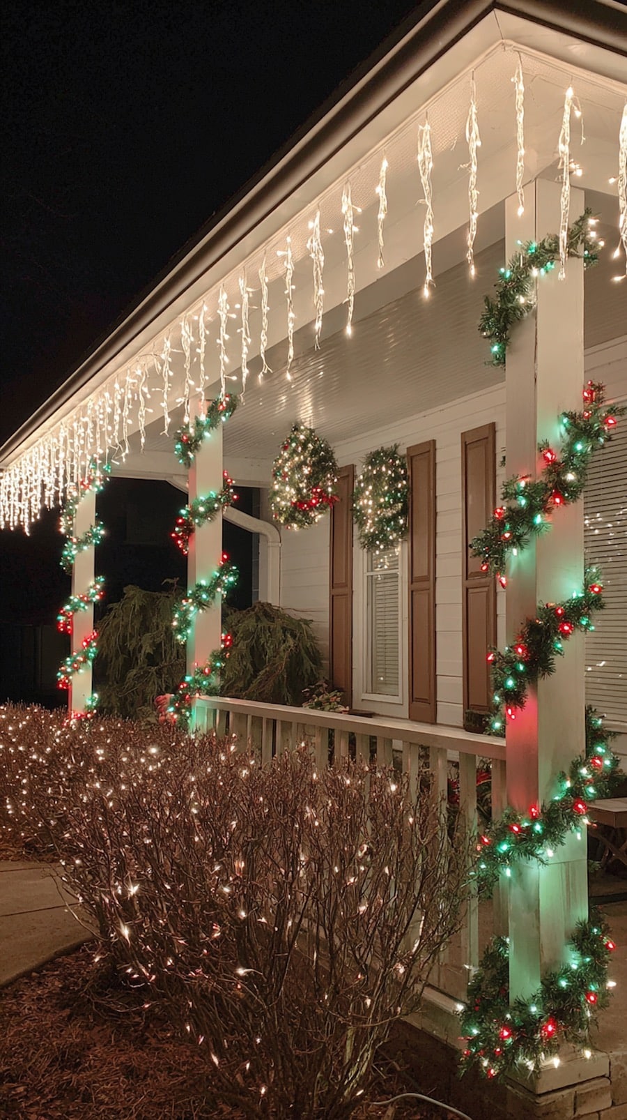 I love how this porch reads like a warm holiday hug. The icicle lights along the eaves give that soft, snowfall sparkle while the red and green garland wrapped around the posts adds playful, classic cheer.