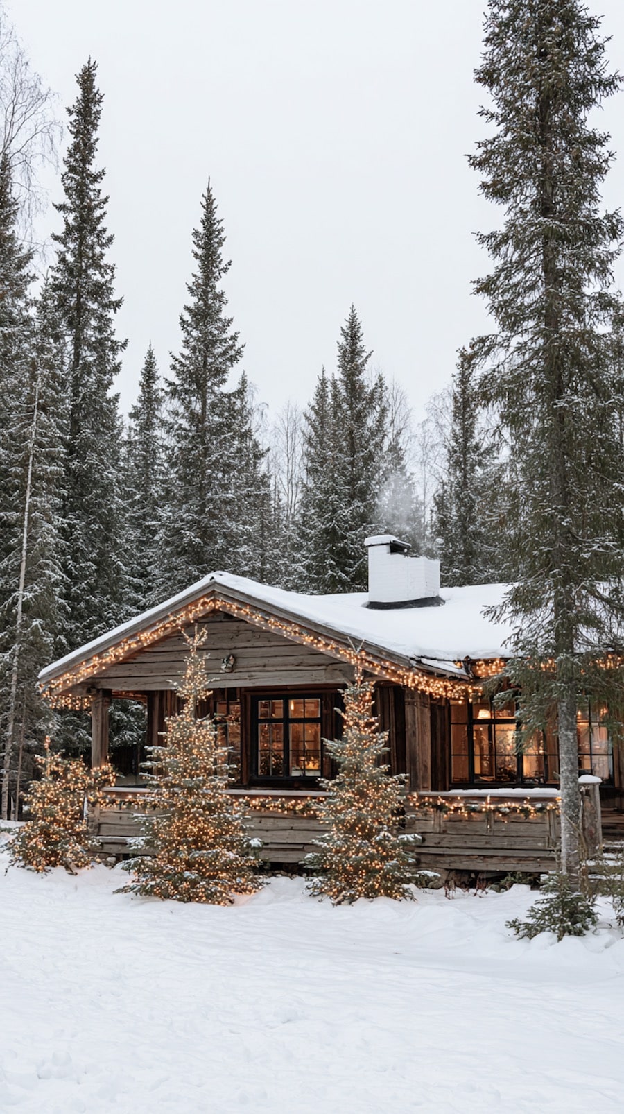 They highlight the wood grain and roofline without being fussy, which makes the whole scene feel lived-in and picture-perfect. This look works best on rustic cabins, cottage porches, and homes with lots of natural texture—anywhere you want a low-key, storybook vibe.