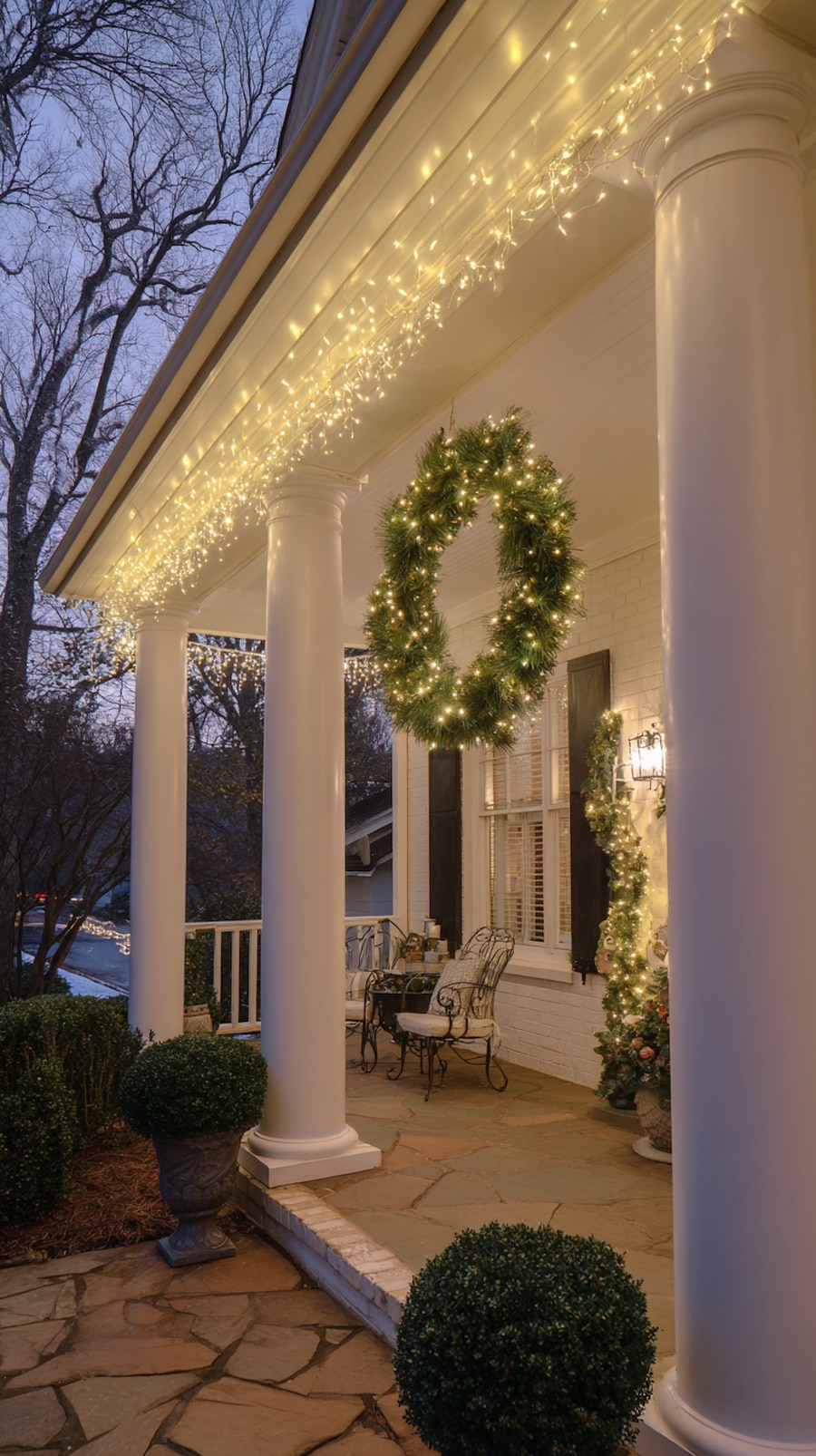 I love how the warm white icicle lights spill from the eaves and make the whole porch glow like a welcoming hug. The oversized lit wreath is giving big-wreath energy and anchors the look so it never feels like a random string of lights.