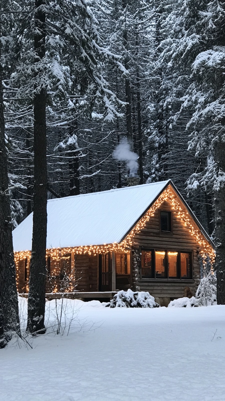 I love how the warm white icicle-style lights trace the roofline and porch, turning the log cabin into a cozy beacon against the snow-dusted pines. The tiny bulbs feel effortless and a little magical, like someone quietly turned the house into the coziest welcome sign in the woods.