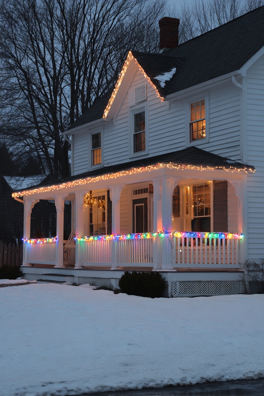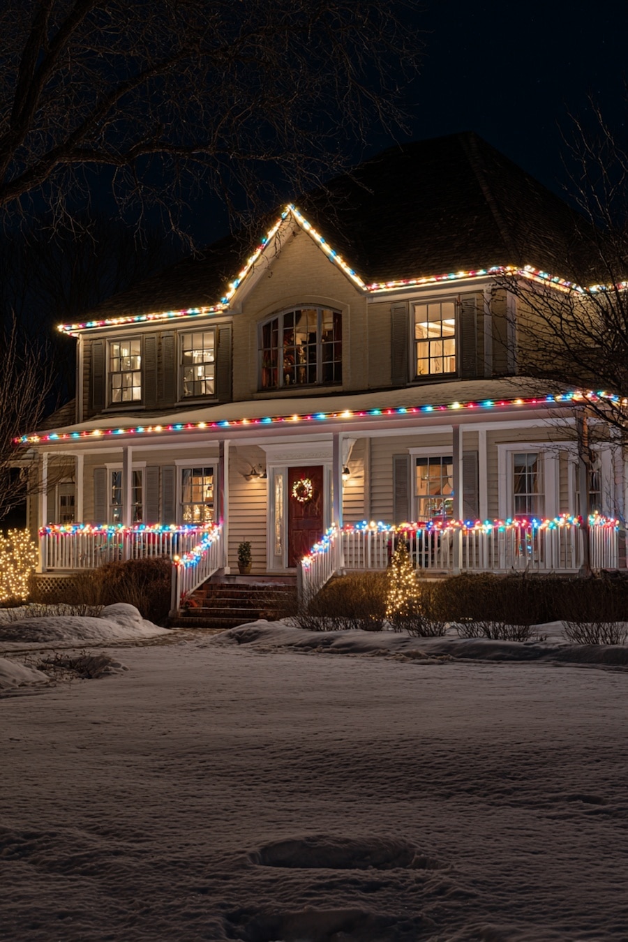 I love the way those classic multicolored bulbs trace the roofline and wrap the porch railing. The lights feel joyful but not over the top, like a cozy neighborhood tradition turned up a notch.