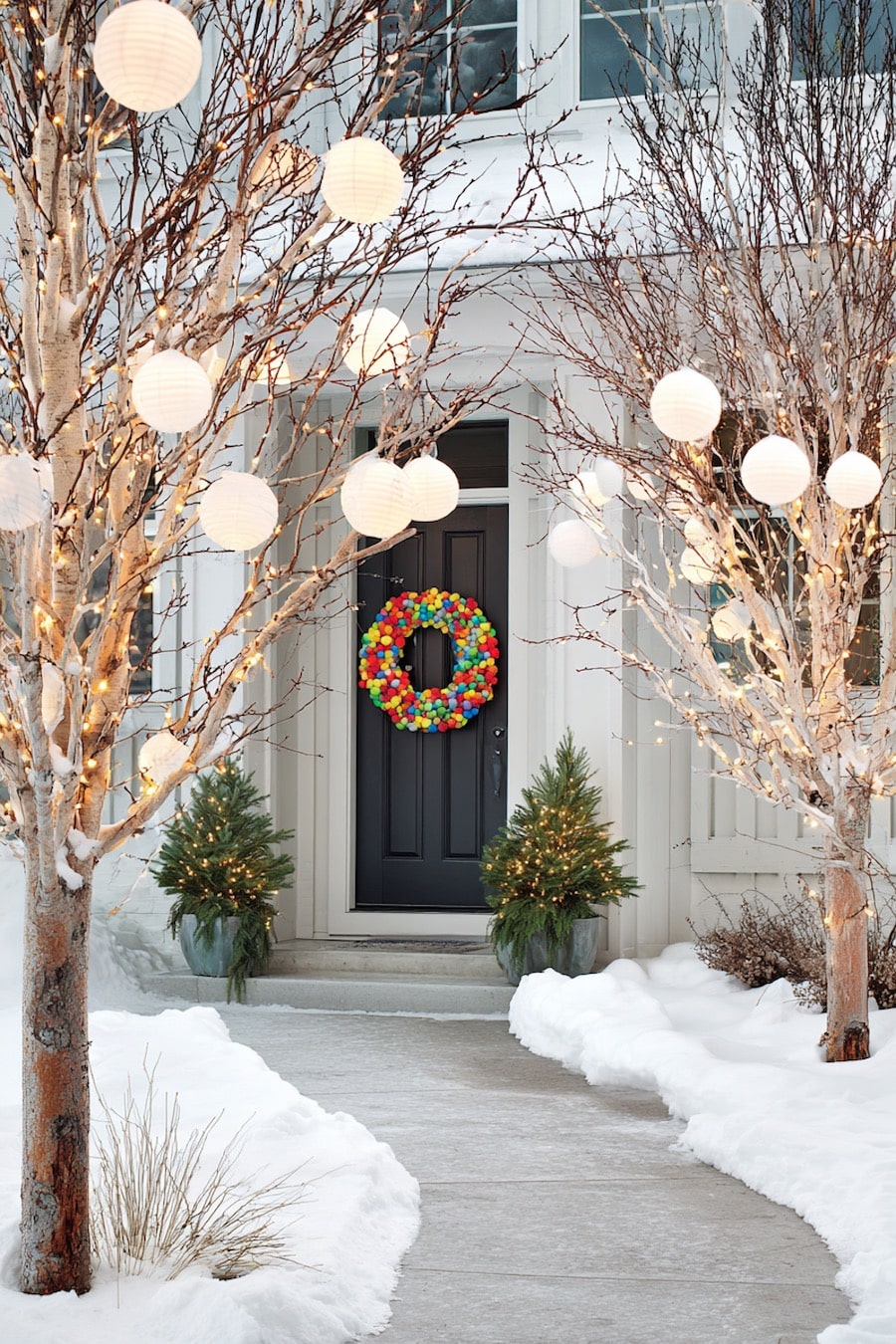 I love how the round lanterns and tiny fairy lights turn bare winter branches into a glowing canopy. The warm light feels like a cozy invitation and makes the dark door and fresh snow pop.