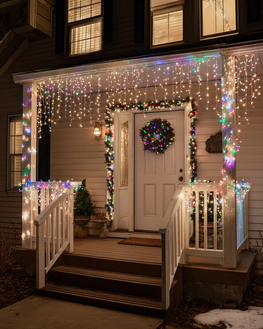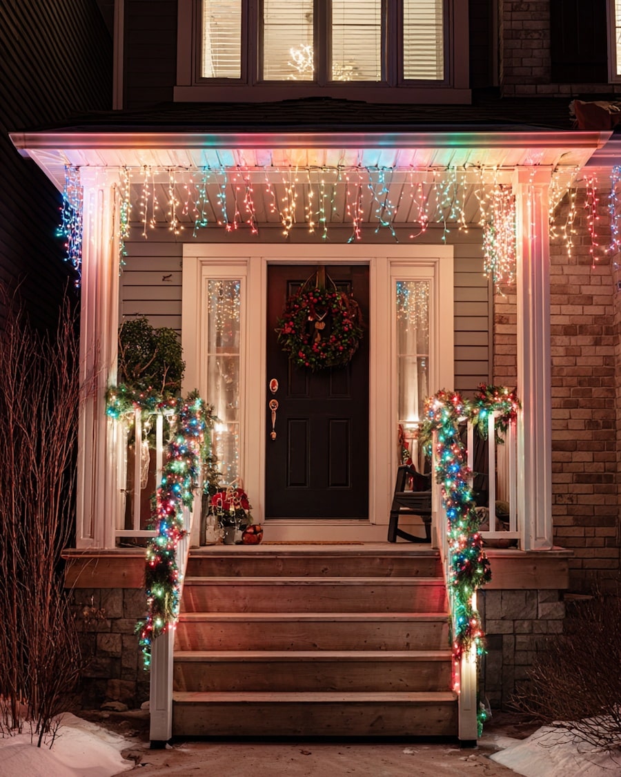 I love how the icicle lights and multicolored garlands turn a plain porch into instant holiday joy. The dripping lights give off a playful, candy-coated glow that feels cheerful not fussy, and the garland wrapped down the banister creates a nice vertical rhythm that draws your eye to the wreathed door.
