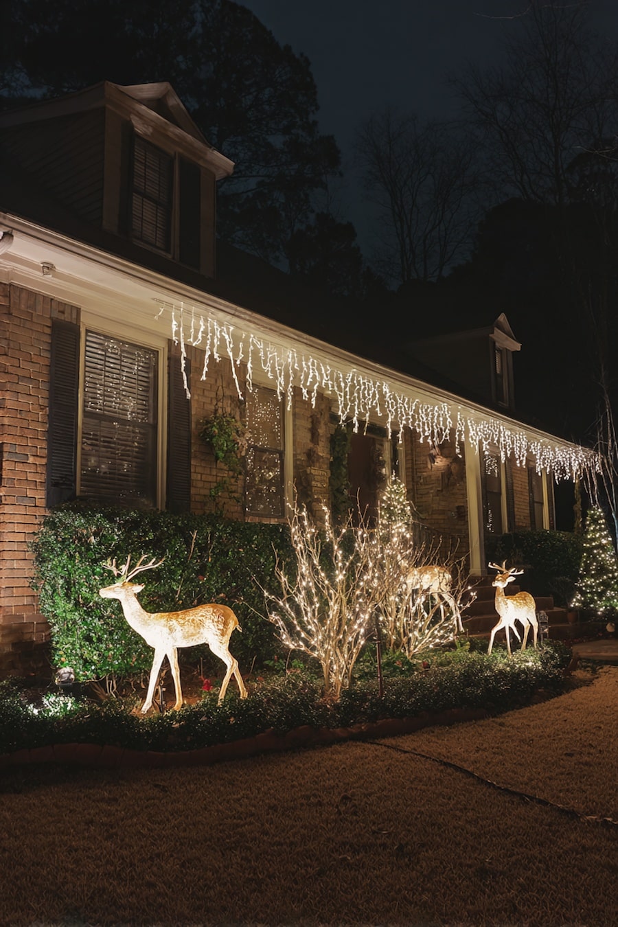 I love the warm, storybook glow of these lights. The icicle strand along the roofline reads classic and festive without feeling overdone, and the lit deer scattered through the hedge add a sweet, slightly whimsical touch that makes the whole front garden feel like a calm holiday movie set.