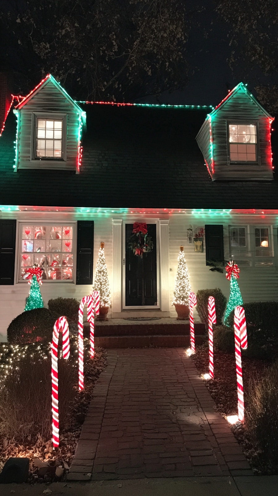 I love the joyful, slightly cheeky vibe of this setup. The red and green roofline gives the whole house a candy-sweet outline while the glowing candy cane path leads you in like it knows a secret.