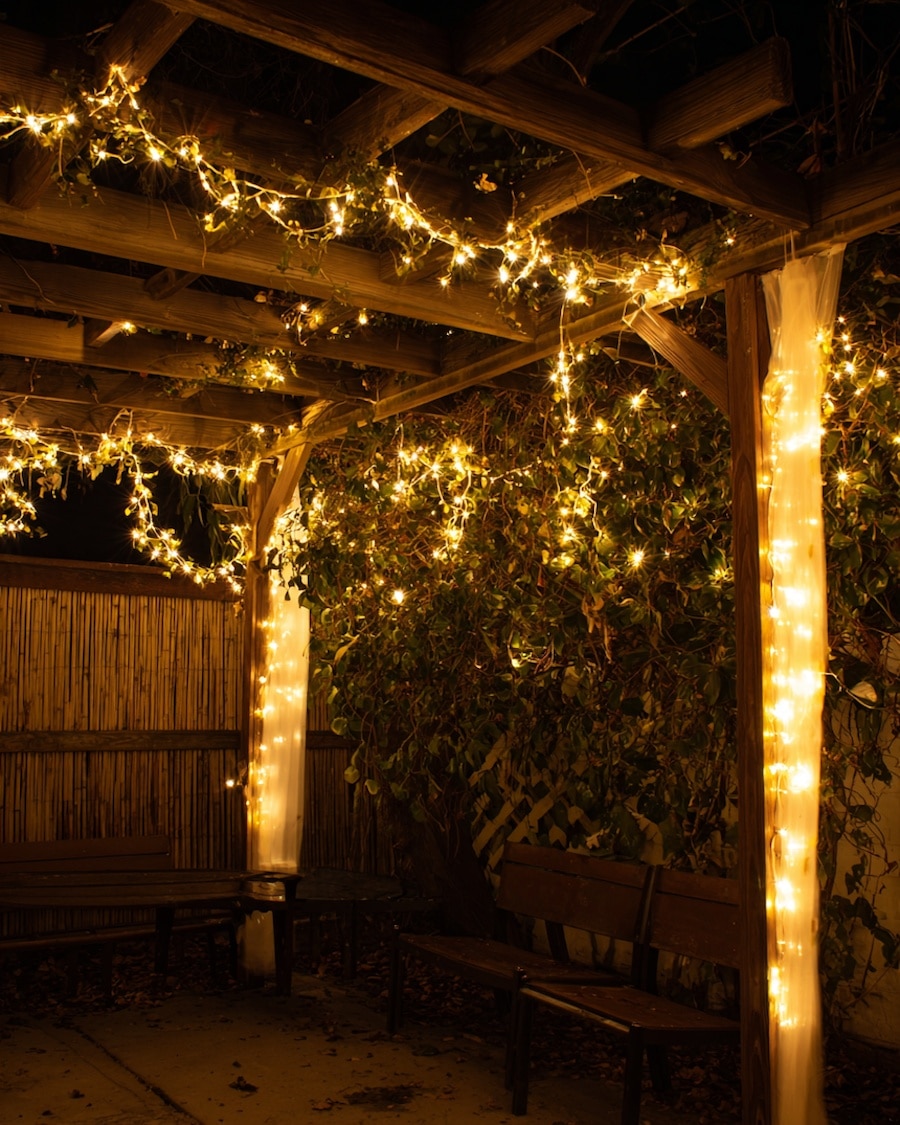 Layer in comfy benches with weatherproof cushions, a textured outdoor rug, a couple of lanterns with LED candles, and potted evergreens or trailing ivy to echo the lights. Wrap the posts with a sheer fabric to diffuse glow, secure everything with weather clips, and use a timer or solar option so the mood is effortless and zero-fuss.