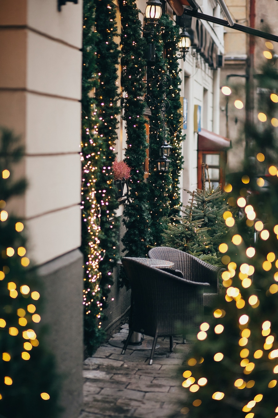 I love how the warm fairy lights tucked into the garland and little pines give this spot instant holiday glow without trying too hard. The amber bokeh makes the cobbled lane and wicker chairs feel like a secret winter cafe, and those lantern-style sconces add old-school charm that’s equal parts cozy and chic.