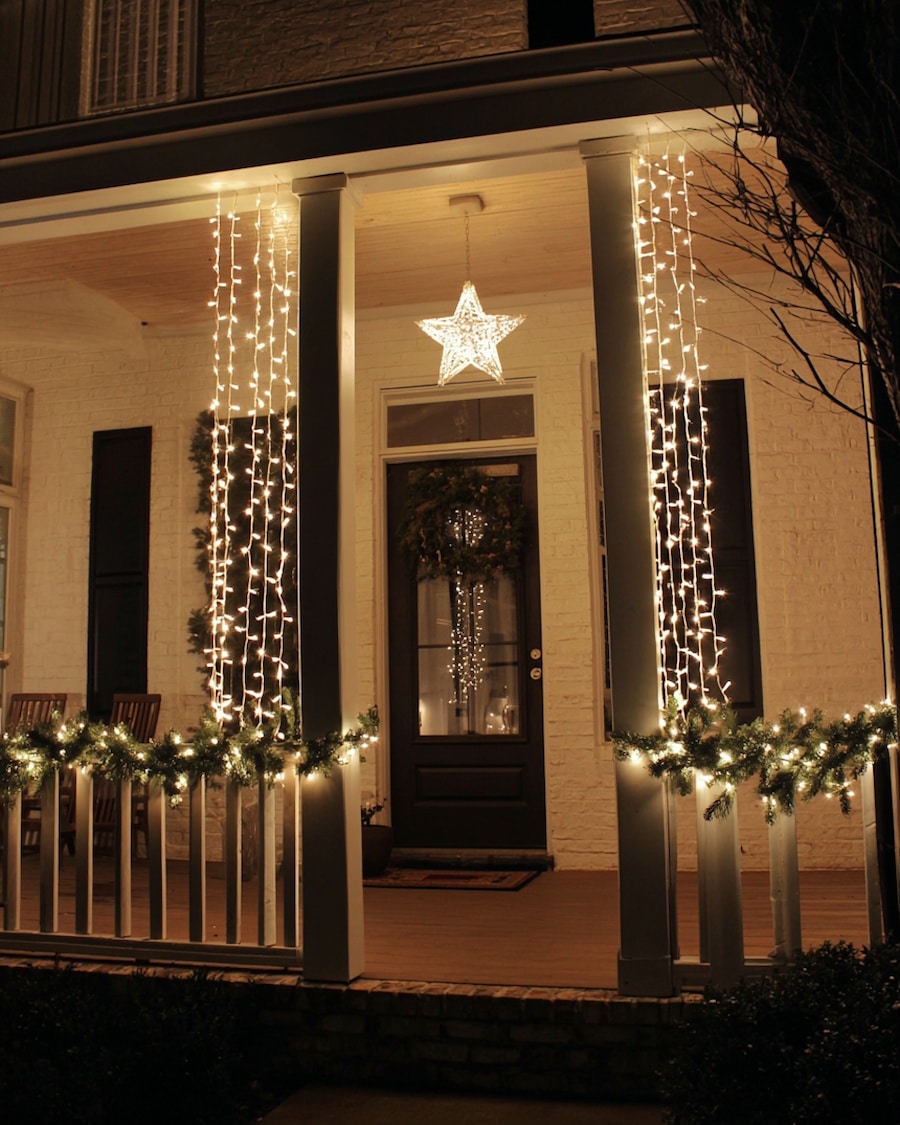I love how these warm curtain lights drip like soft icicles around the porch posts while the glowing star hangs like the cherry on top. The combo of a neat garland along the railing and the star over the door feels effortless and pulled together, like holiday magic that didn’t try too hard.