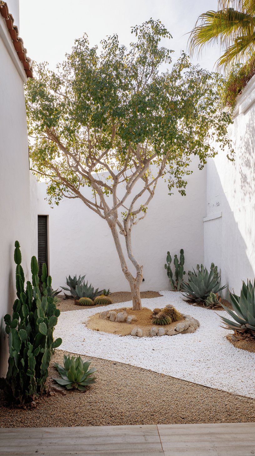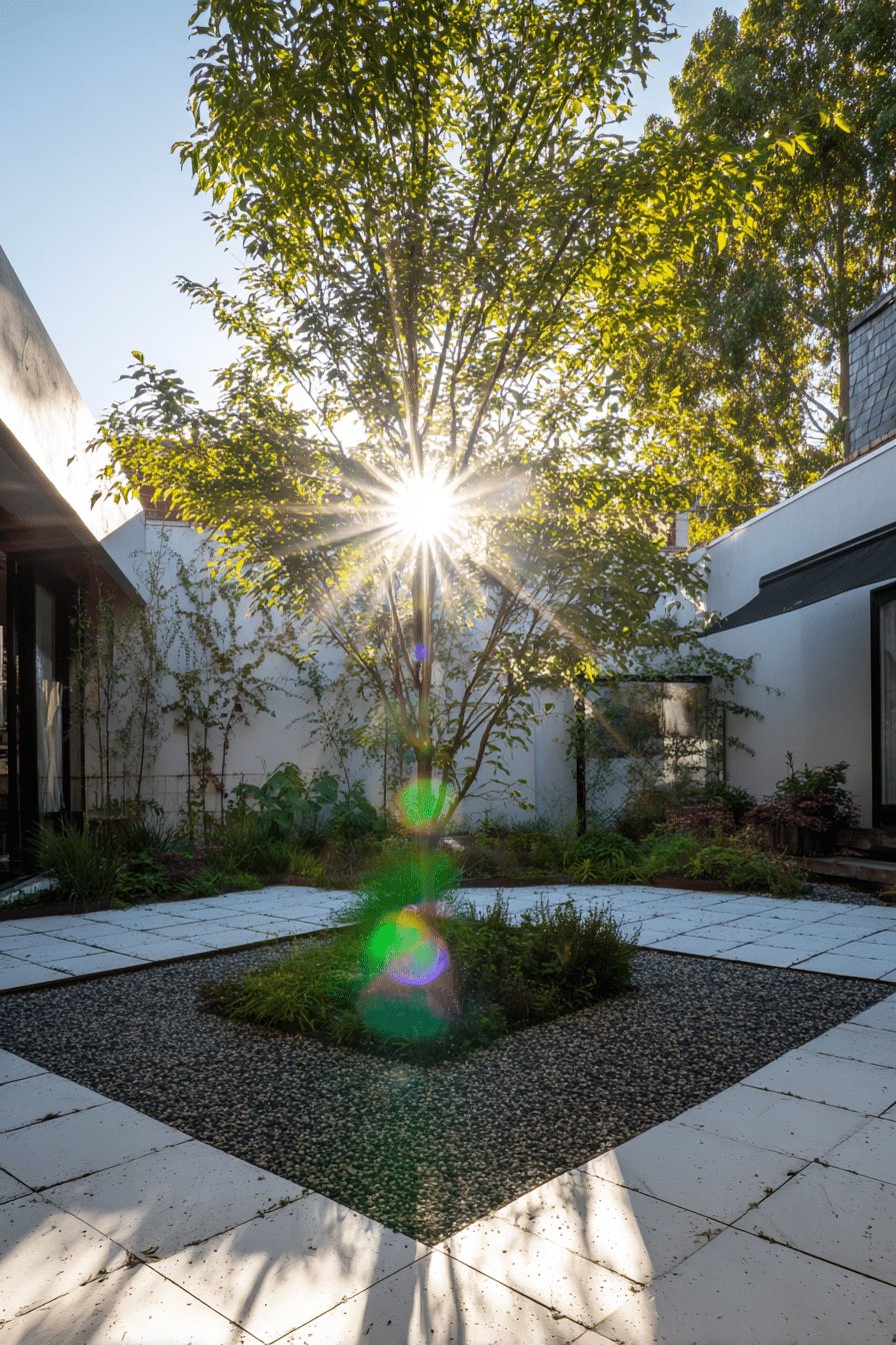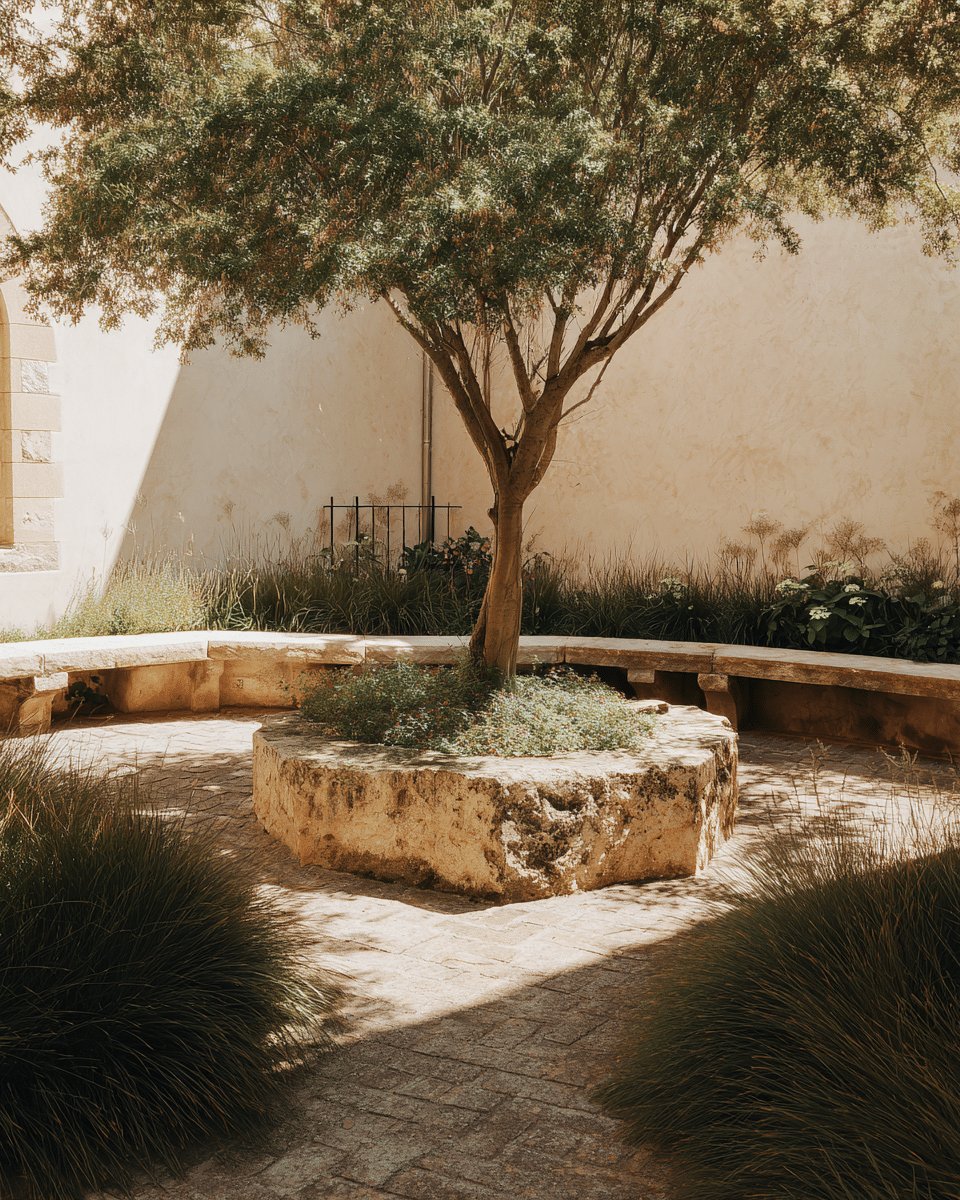 I love how the central tree feels like the whole courtyard finally exhaling. A round stone planter lifts the trunk like a little stage, while the pale gravel keeps everything clean and sun-baked.