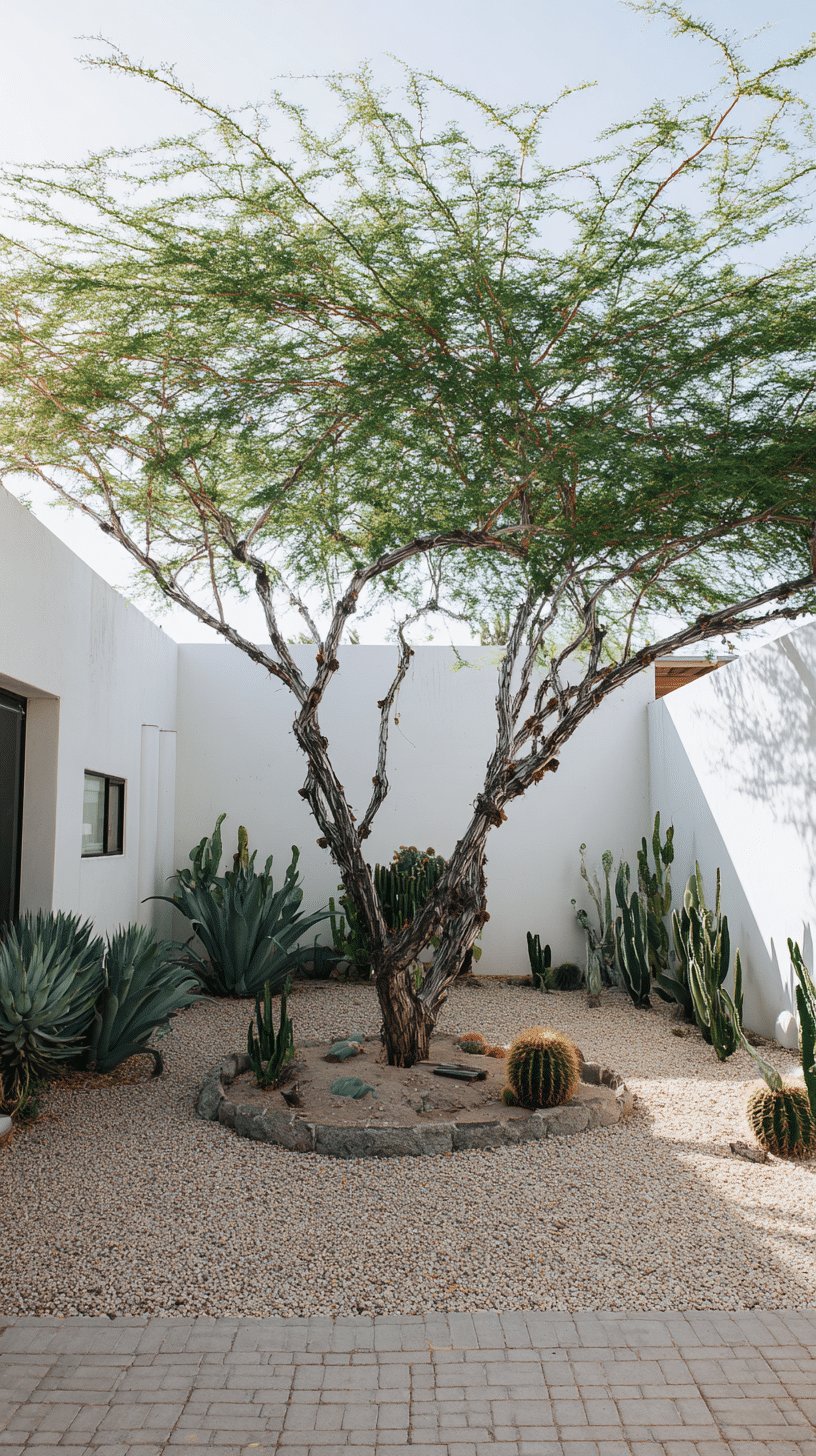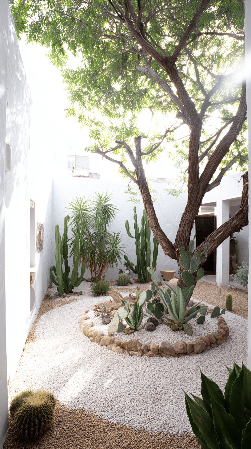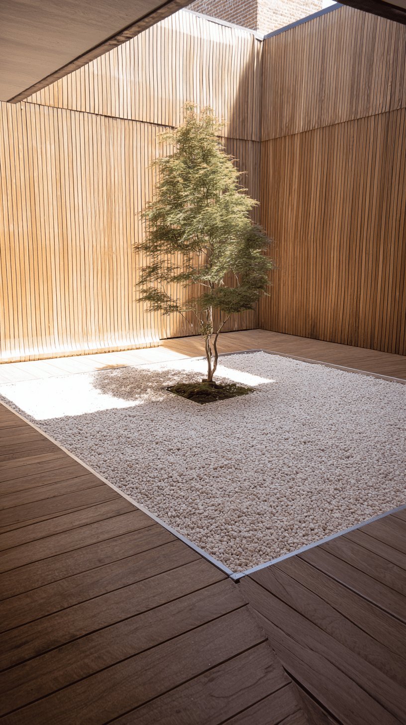 I love how the central tree feels like the whole courtyard finally exhaling. A round stone planter lifts the trunk like a little stage, while the pale gravel keeps everything clean and sun-baked.