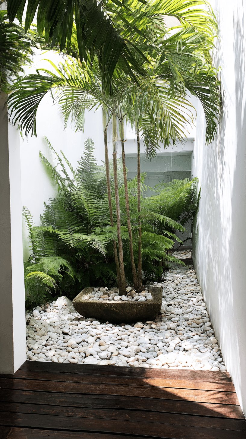 I love how this courtyard feels like a tiny tropical hideaway squeezed between clean white walls. A low, weathered stone planter holds a cluster of skinny trunks that throw a delicate canopy of palm fronds, while a bed of ferns softens the back edge with lush texture.