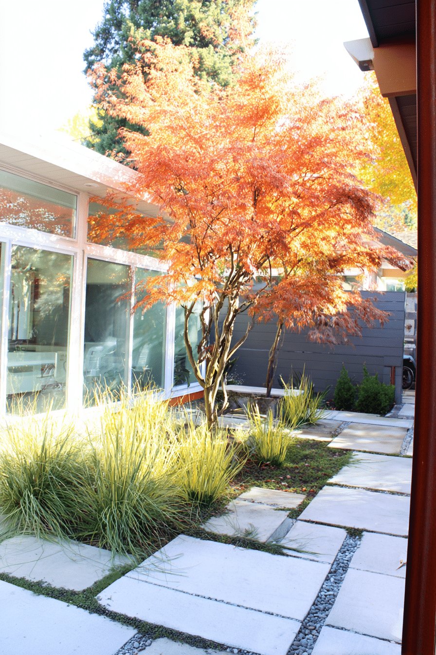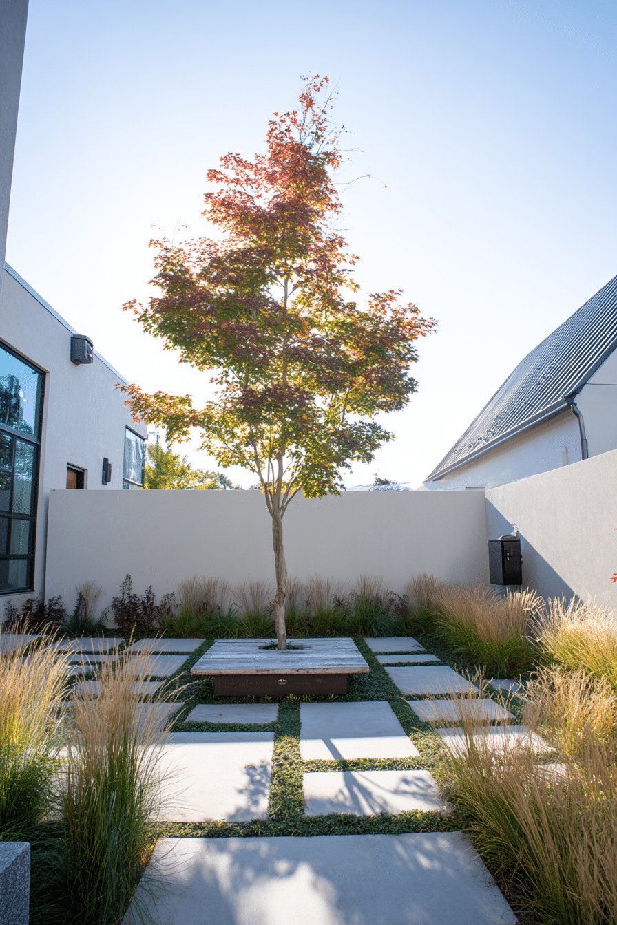 I love how the tree in the middle feels like the whole courtyard took a deep breath and relaxed. The round planter and low stacked-stone bed give the tree a stage, while a halo of variegated ornamental grasses softens the edges.