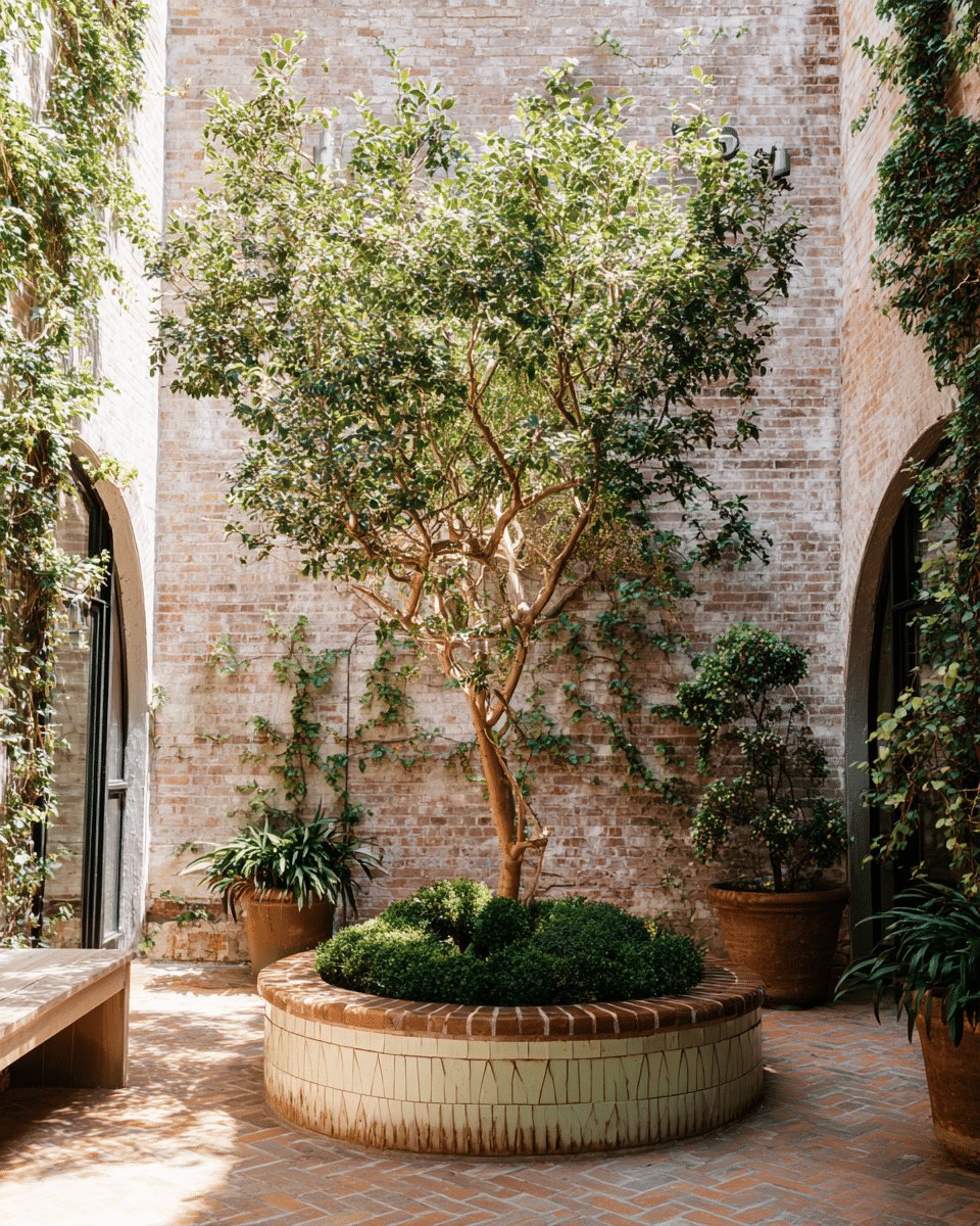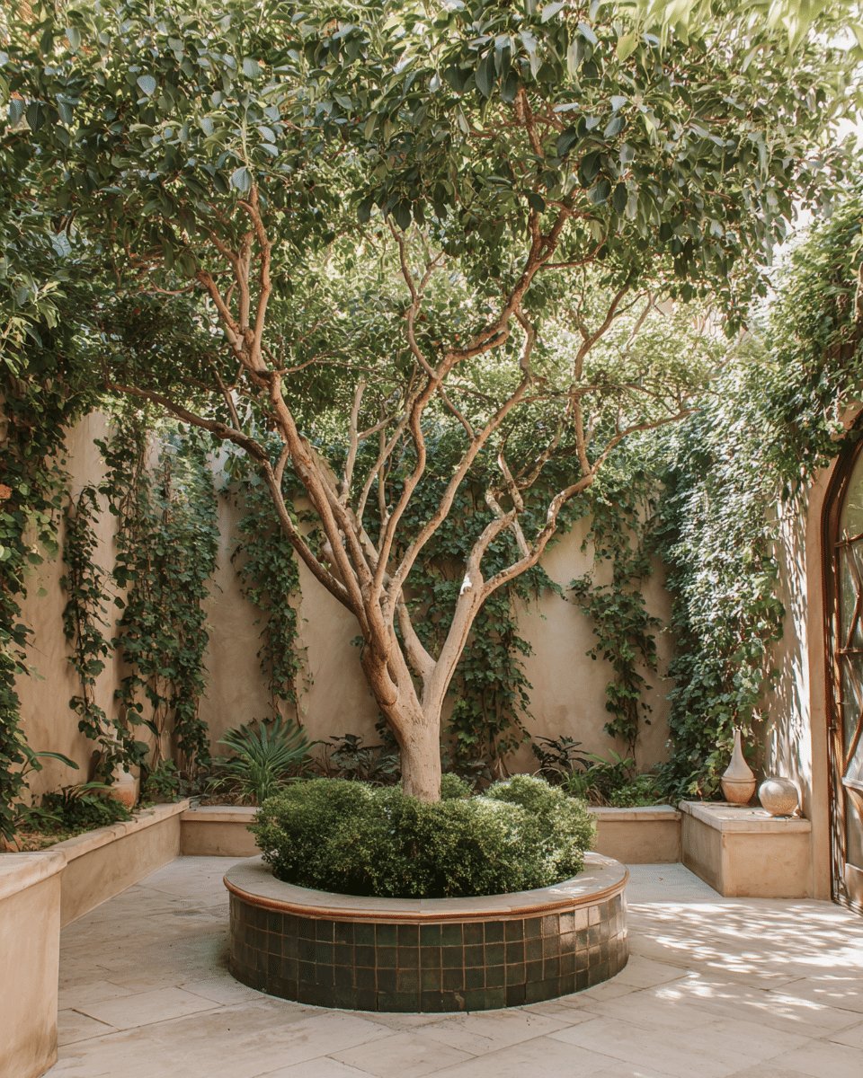 I love how the twisting trunk becomes the room’s centerpiece, its canopy spilling dappled light like a natural pendant. The round tiled planter with a neat boxwood halo feels curated but not precious, and the low stucco benches around the edges practically beg you to sit down.