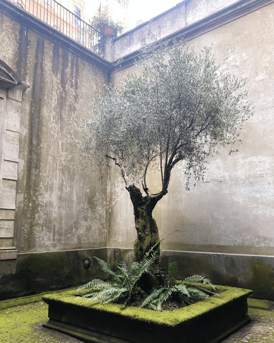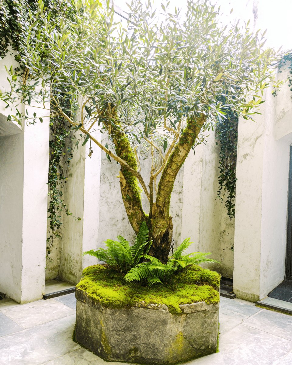 I love the quiet, slightly theatrical vibe of this courtyard. The gnarled olive sits like an old friend in the mossy square planter, ferns fanning out at its feet and that soft, weathered plaster wrapping everything in a muted, timeless glow.