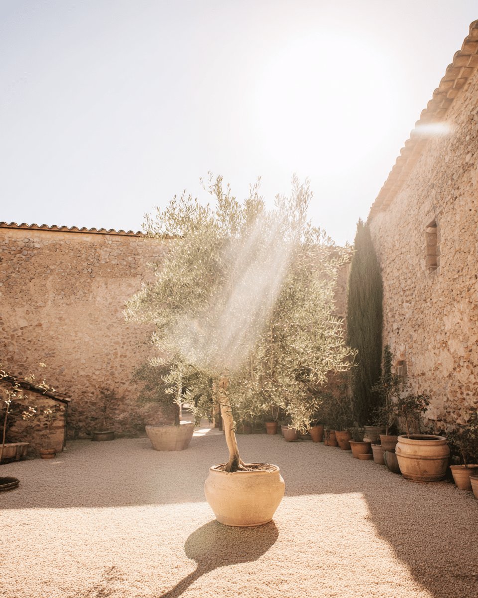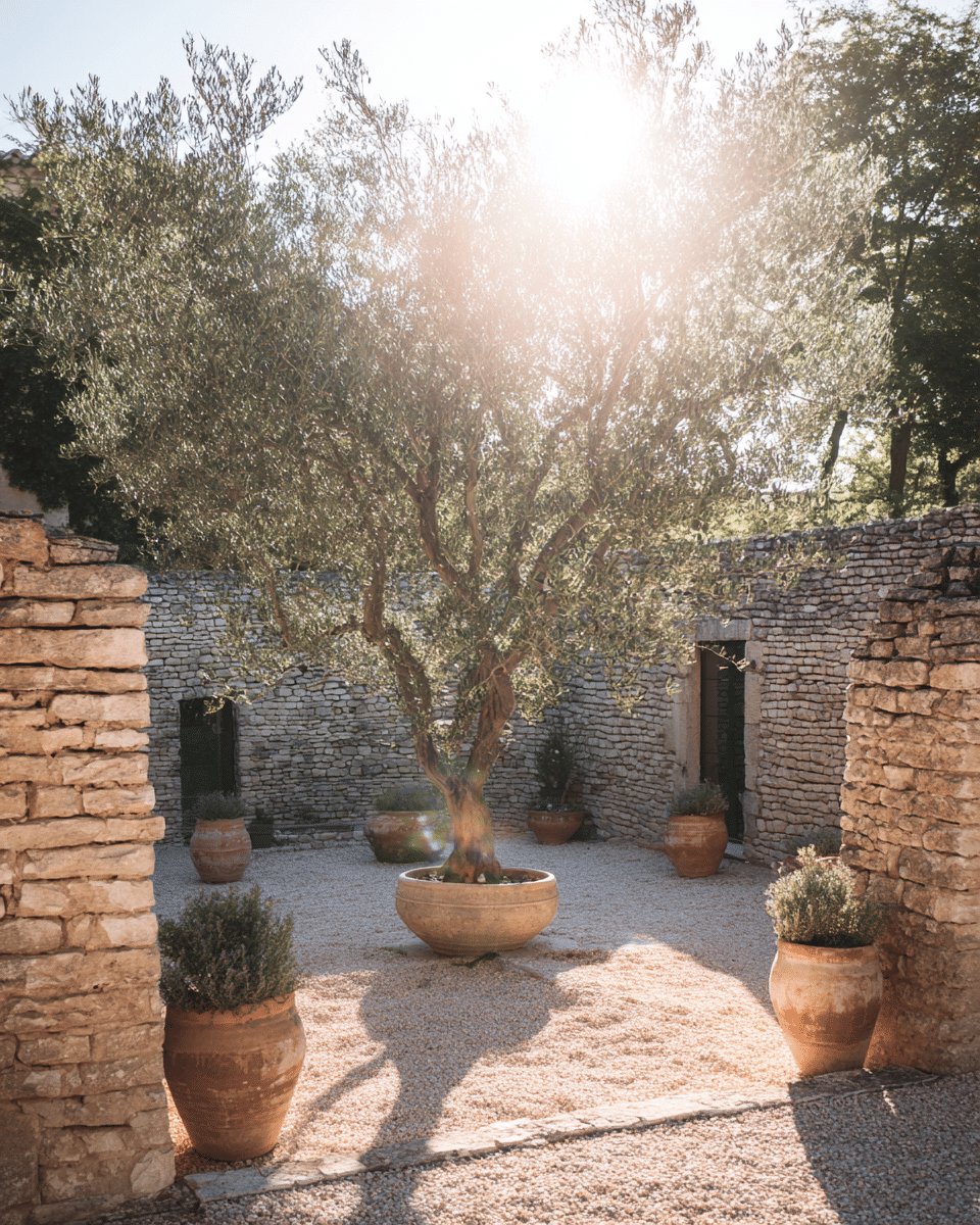Low drystone walls and weathered terracotta pots filled with rosemary and lavender give it that effortless Mediterranean calm. The light is everything here — dappled through the leaves, softening the stone and making the whole space feel both sculptural and easy to live in.