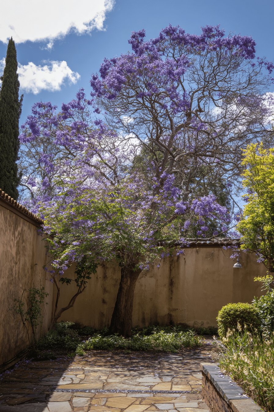 I love the secret-garden vibe of this walled courtyard. A purple-flowering tree sits dead center and throws dappled shade over warm flagstone paving, while a scattering of petals feels deliberately undone in the best way.