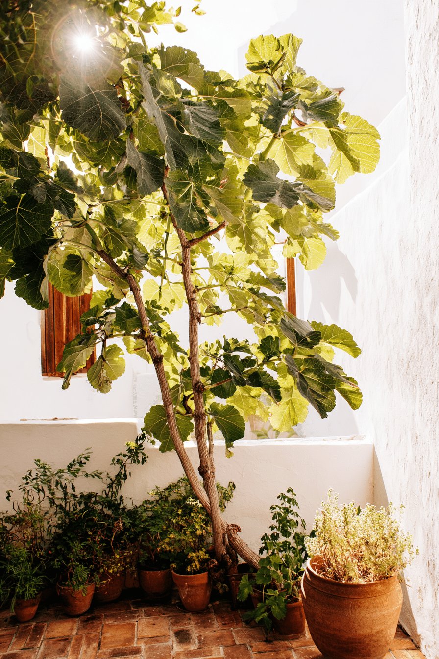I love the sunlit, quiet energy of this courtyard. That big, sculptural tree in the middle gives the whole nook instant drama while the white stucco walls and warm terracotta tiles keep things grounded and calm.