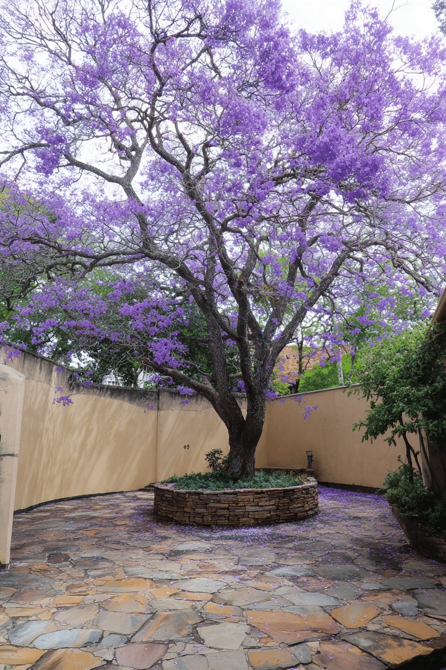 I love the theatrical purple canopy of the tree planted smack in the middle. It reads like a confetti crown over the courtyard, and that raised circular stone planter makes it feel intentional, not accidental.