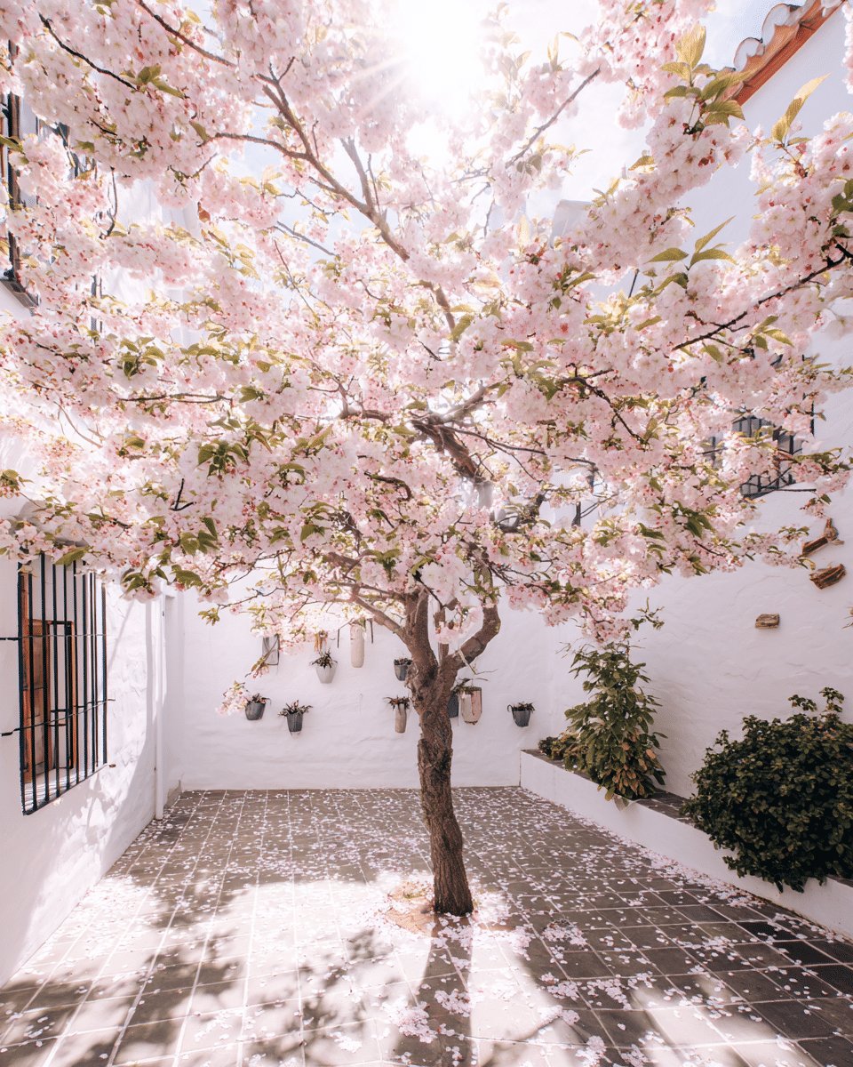 I love how the single flowering tree sits like the room’s quiet showstopper, its pale pink canopy softening the white stucco walls and casting a confetti of petals across the tiled floor.